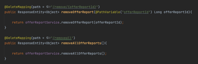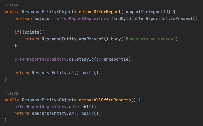 Од страна на бекенд апликацијата, барањата ќе бидат пресретнати од контролер, кој што користи сервис и доколку се брише само една пријава, се повикува метод од сервисот каде што се проследува id-то и се брише пријавата, а доколку се бришат сите пријави се повикува друг метод каде што автоматски ќе се избришат сите.