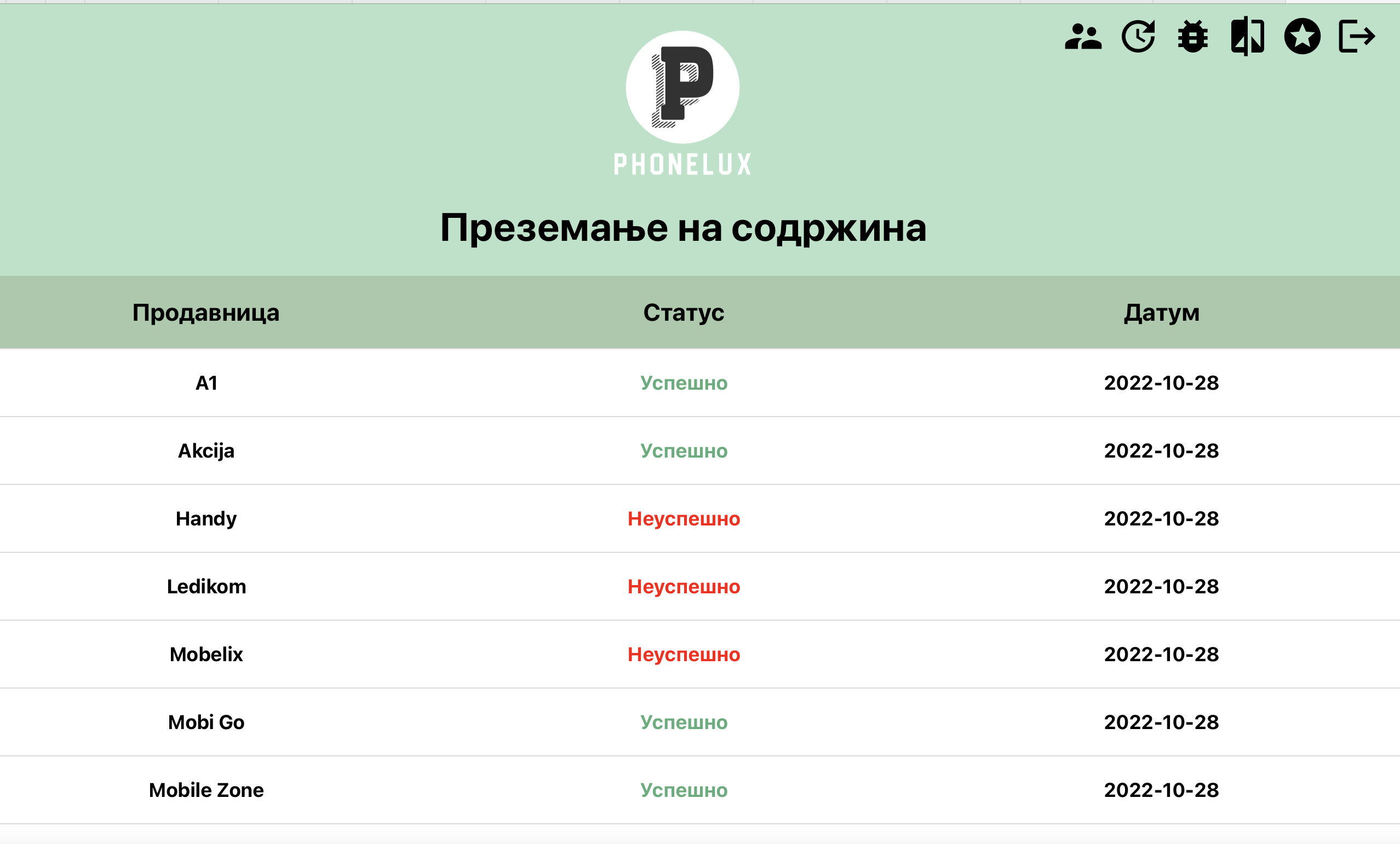 При клик на иконата за невалидни понуди, ќе бидеме редиректирани и ќе се прати GET барање до бекендот, каде што се земаат сите преземања како и нивниот статус (успешно/неуспешно) и ќе се излистаат на страницата.