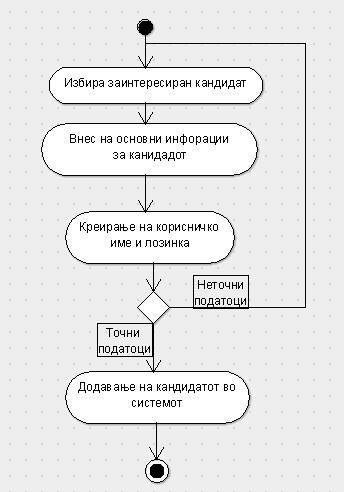 | Postconditions: | 1.Кандидатот е додаден, следно треба да ги внеси потребните податоци