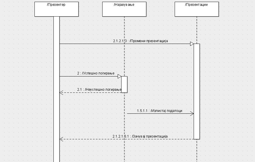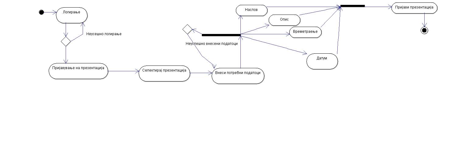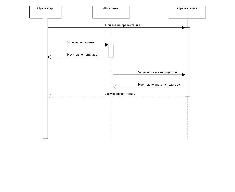 | Postconditions: | Презентерот успешно ја пријавил својата презентација