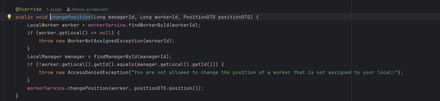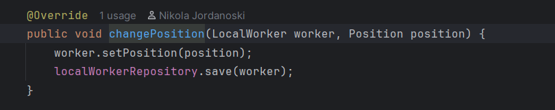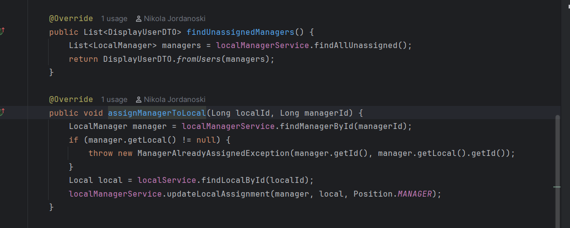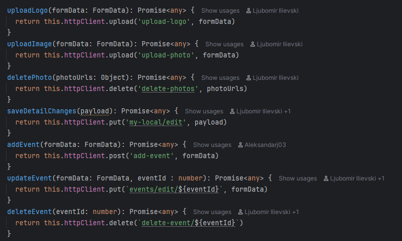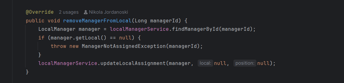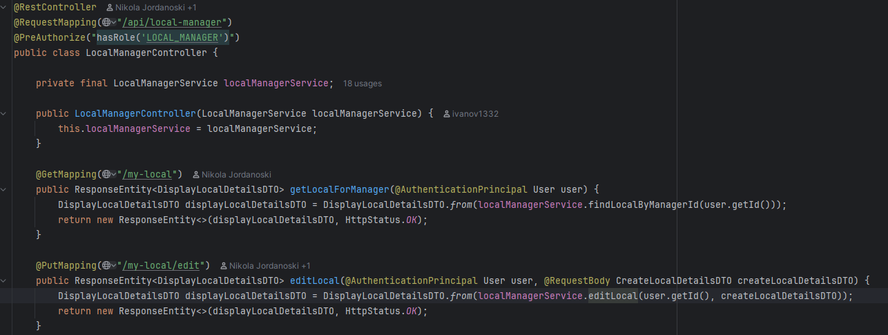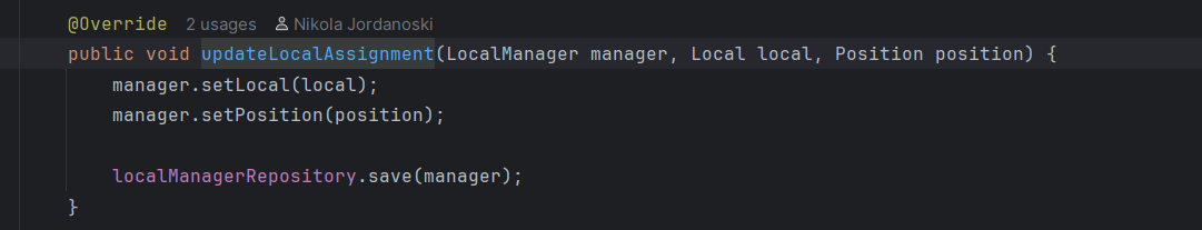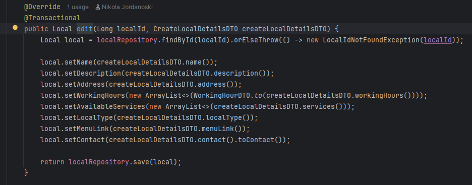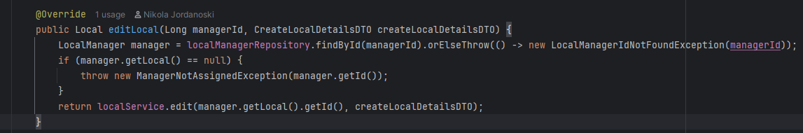 Во сервисот се повикува соодветна функција каде прво се наоѓа менаџерот преку id-то, соодветно се фрлаат исклучоци ако менаџерот го нема во базата или ако не му е доделен локал, ова ќе резултира до враќање на error пораки на front-end. Ако се тоа е во ред преку edit функцијата се изменуваат податоците и преку repository-то се зачувува локалот променет во датабазата. Дополнително назад кон контролерот се испраќа објекот измапиран во друга класа, а потоа назад до front-end апликацијата каде повторно се зачувува во state-от за локалот.
