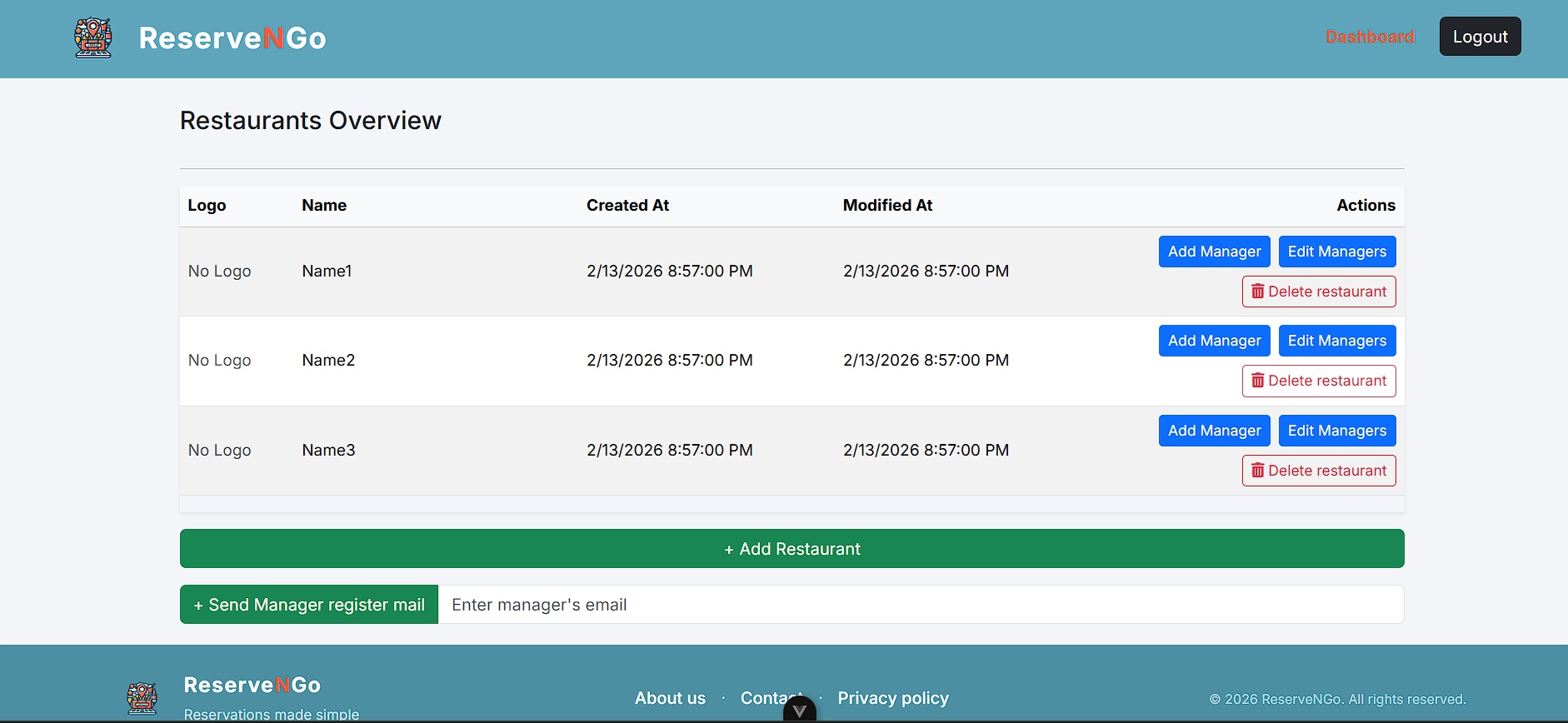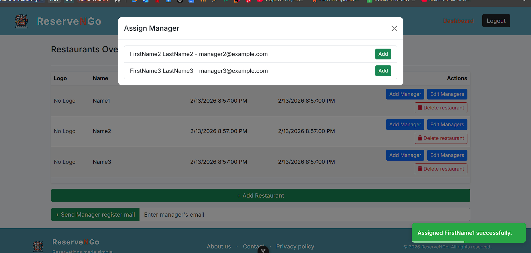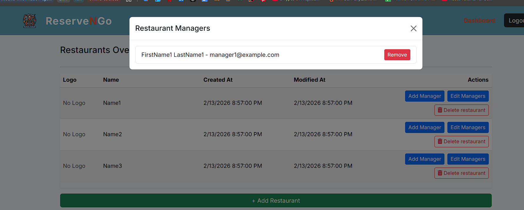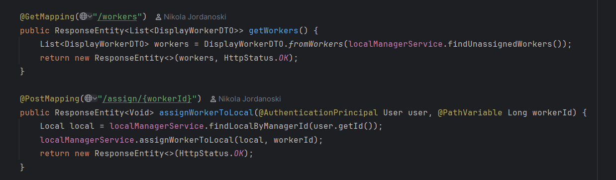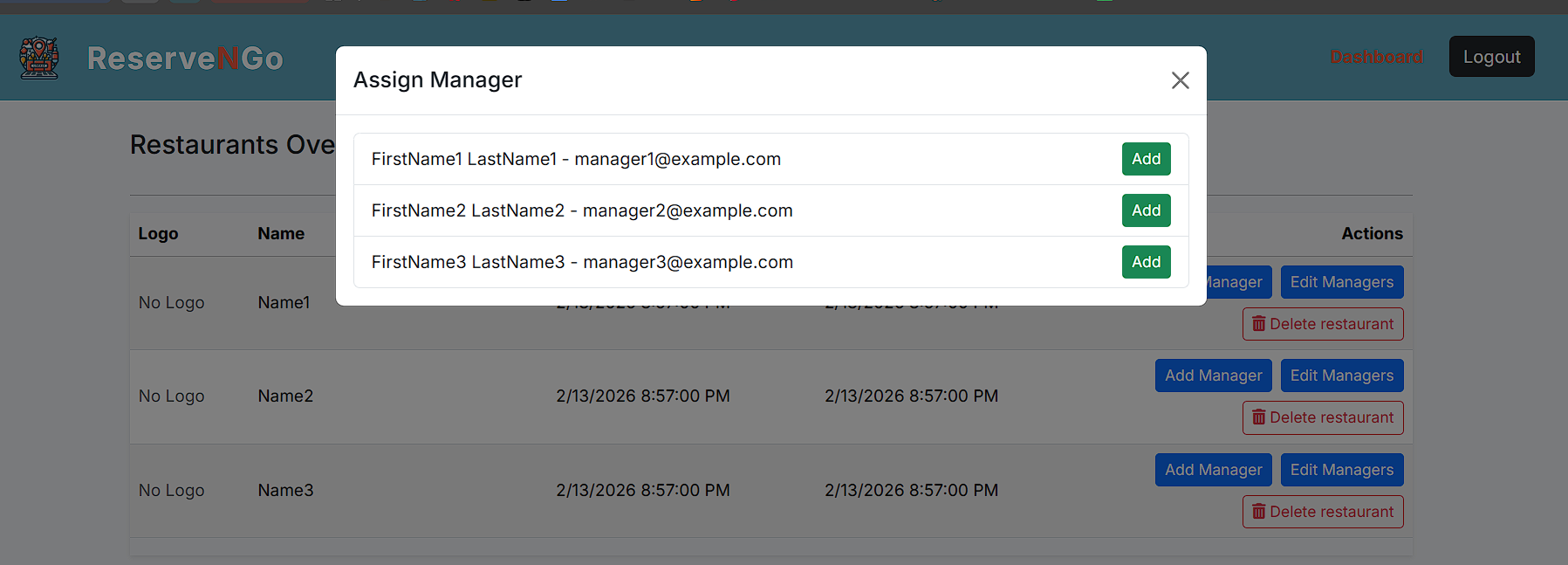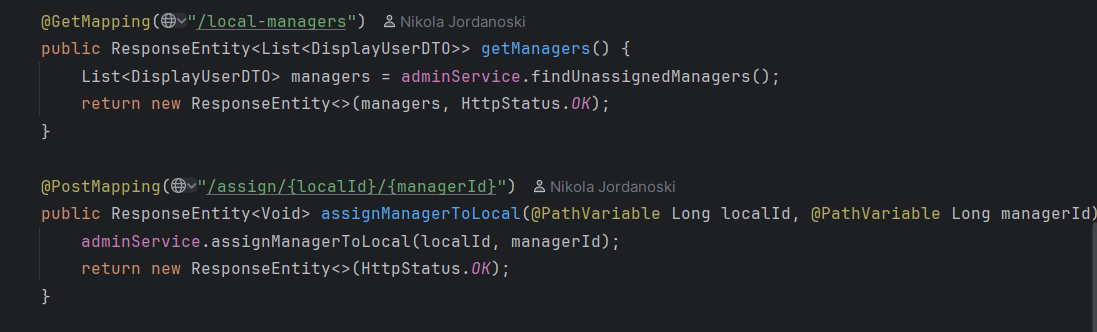 Администраторот има две опции со кои може да ги контролира менаџерите, односно може да додели менаџер на одреден локал или пак да отстрани менаџер кои бил доделен на некој локал. Доколку сака да додели менаџер на некој локал тоа го прави со клик на копчето „Add Manager“, при што се праќа POST барање до backend, каде што контролерот го превзема барањето и со помош на сервисниот слој го обработува истото.