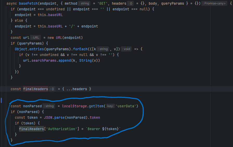 baseFetch е метода од Httpclient класата која служи како генерично централизирано место на конфигурирање на http повици до back-end, најважниот дел од оваа метода е додавањето на Jason Web Token како header во http повикот, за подоцна backend-oт да може да ја потврди легалноста на акцијата од корисникот.