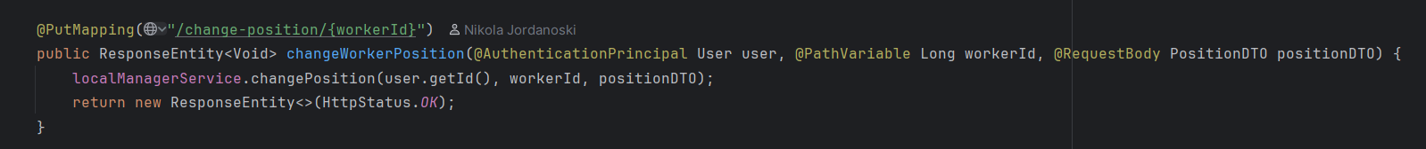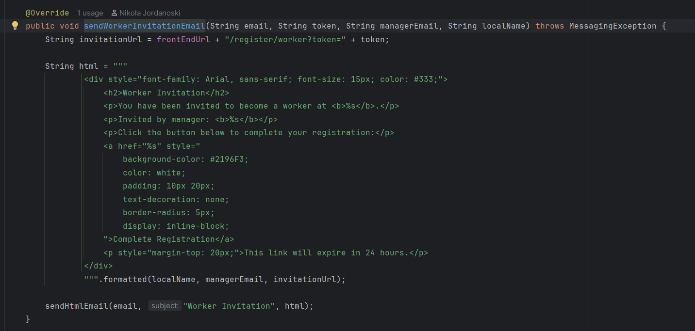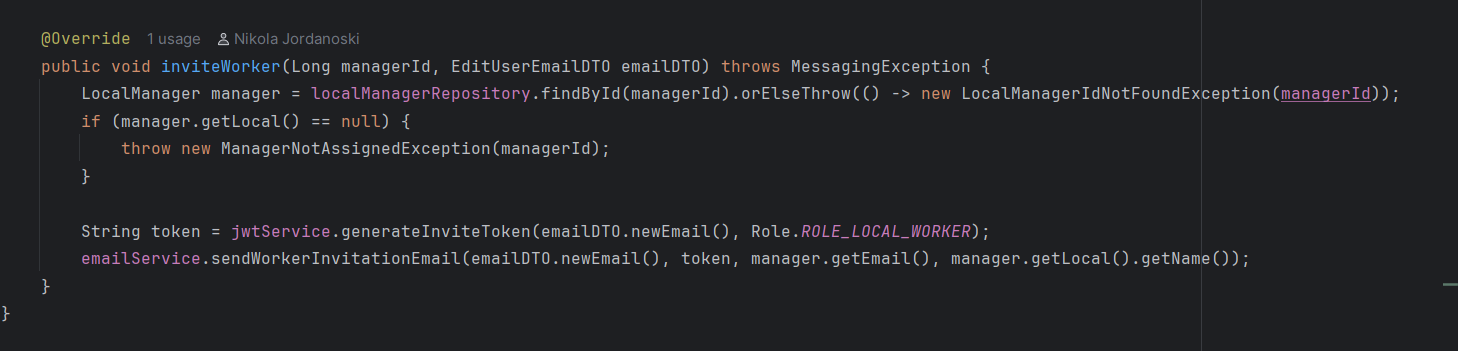 Целиот овој момент е реализиран на backend страната. Имаме контролер кој се справува со барањето кога менаџерот ќе испрати e-mail до корисникот. Сервисниот слој го обработува барањето, односно целиот момент што го погледнавме погоре, сервисниот слој се грижи за тоа.