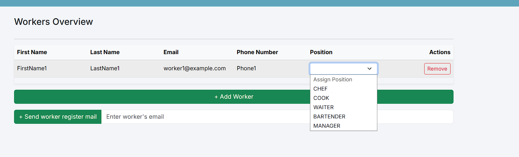 При додавање на работник, тој сеуште нема да има позиција, но менаџерот може да му додели со помош на dropdown секцијата каде што менаџерот одбира што позиција ќе работи нововработениот.