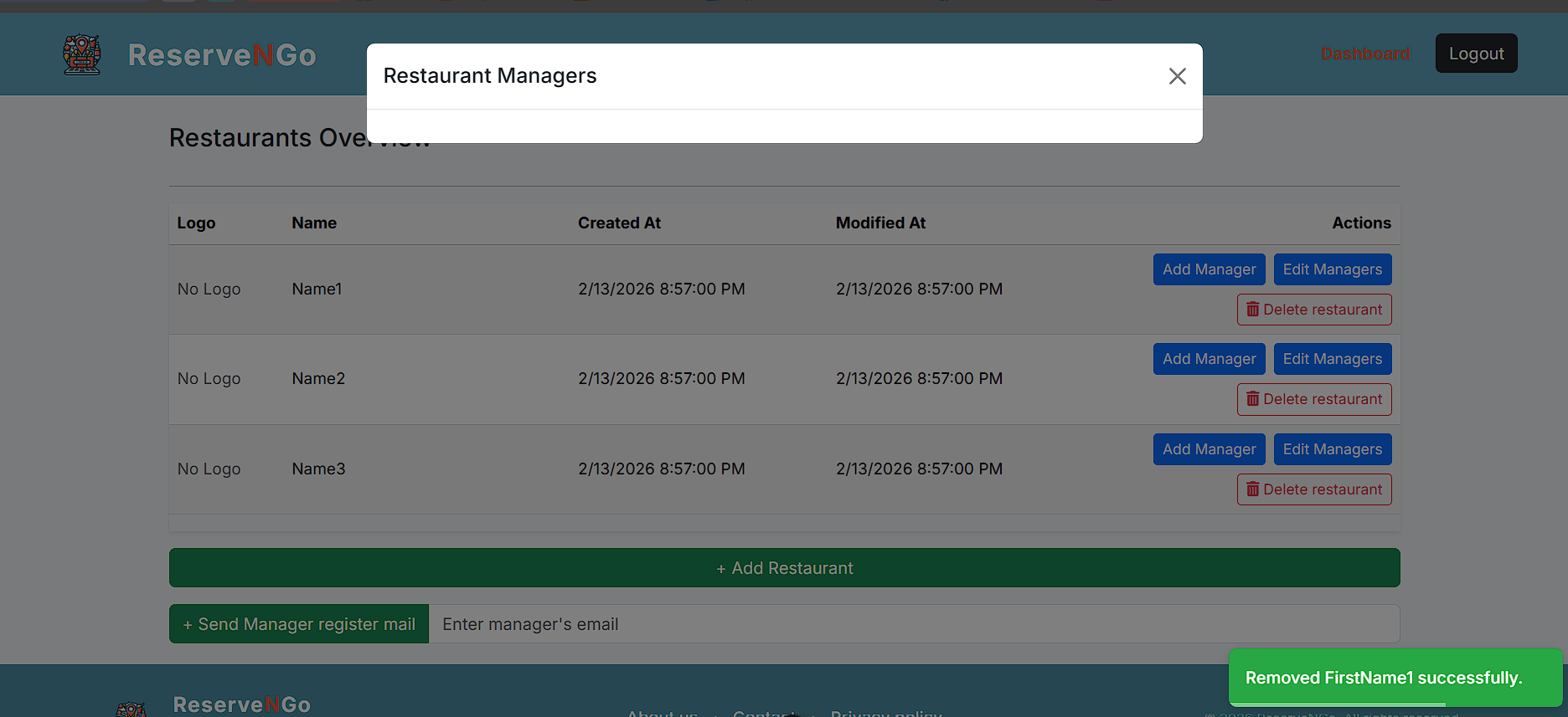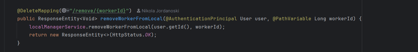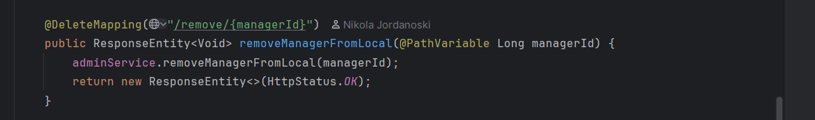 Доколку сака да отстрани некој менаџер од локал не е ништо покомплицирано, администраторот во овој случај кликнува на „Edit Managers“ каде што има листа од менаџери за тој локал. Кликнува на копчето „Remove“ и како и кај доделувањето се праќа барање до backend-от но во овој случај тоа барање е DELETE. Контролерот го превзема барањето и повторно со сервисниот слој го обработува.