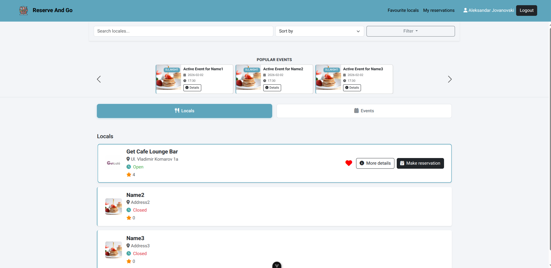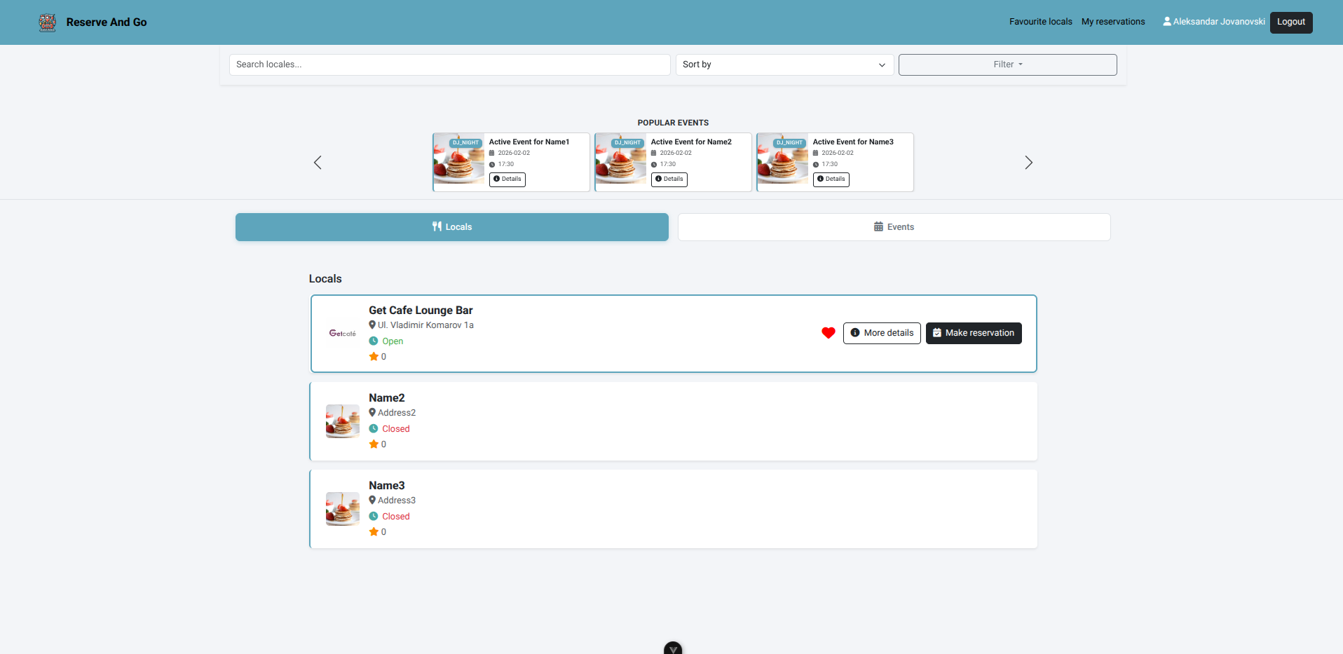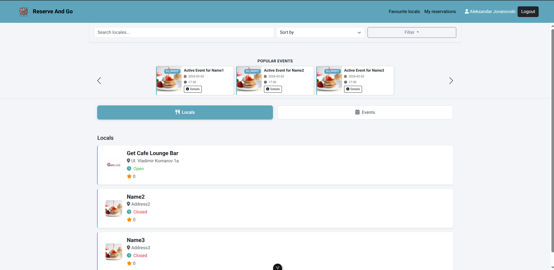Корисникот по неговата најава е пренасочен на „главната“ страна каде што се прикажуваат сите локали.