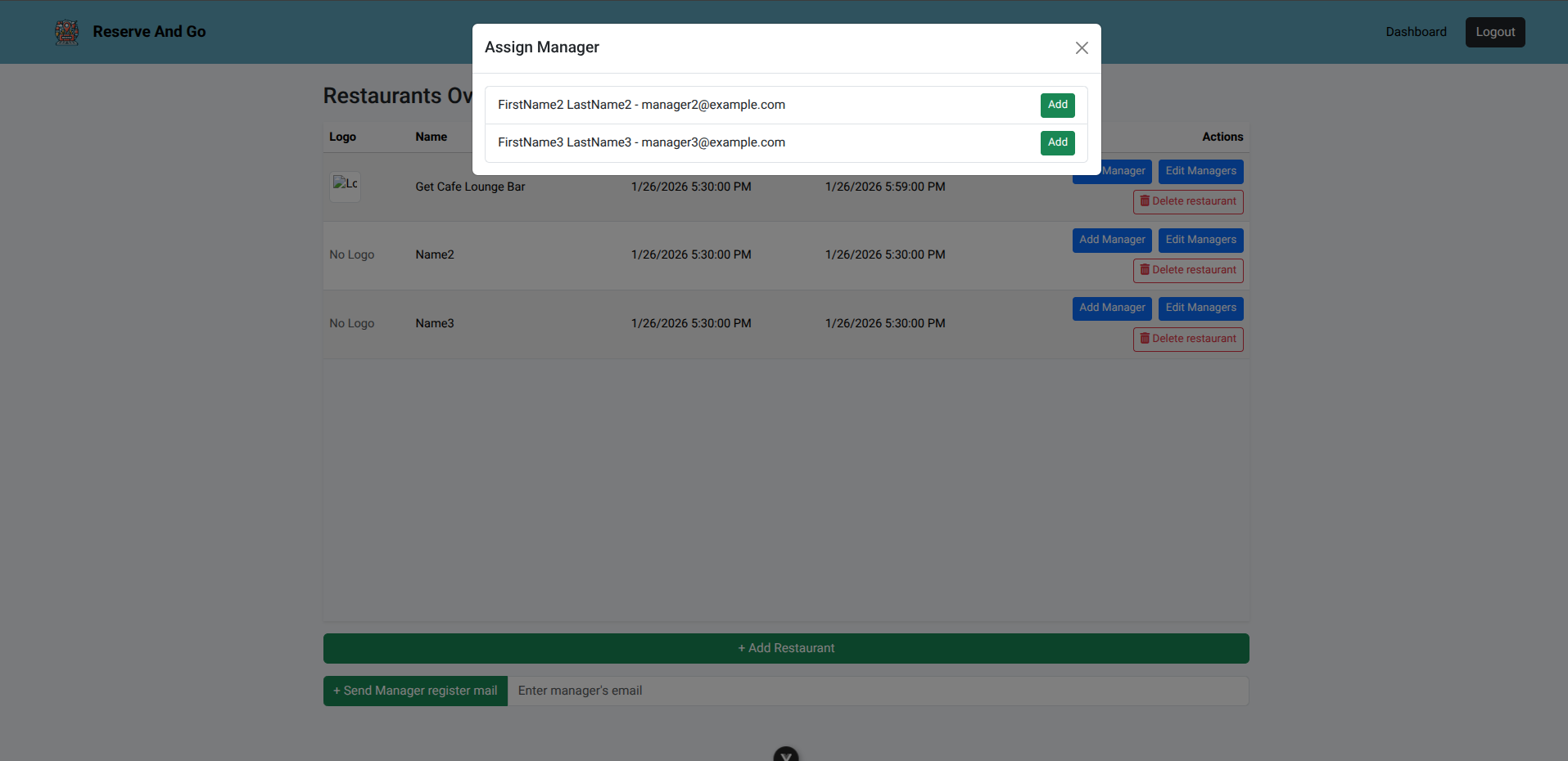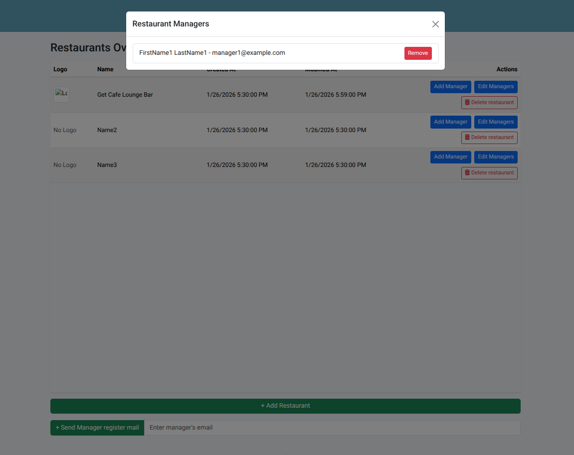 Администраторот на страницата “Admin Dashboard” има можност за одреден локал да додаде односно измени или избрише одредени корисници кои се претходно најавени како менаџери на локали.