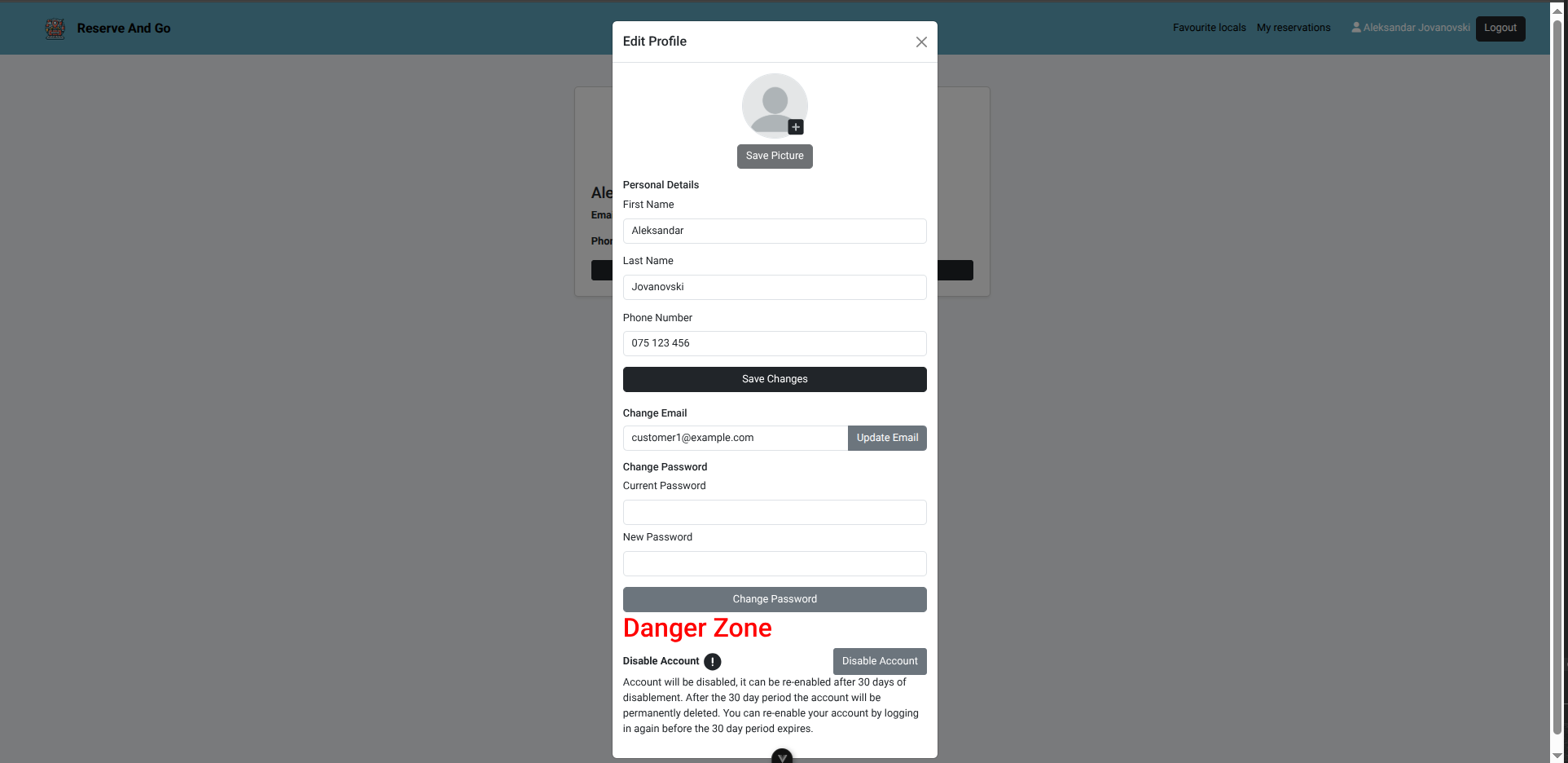 Секој најавен корисник ја има можноста на менување на своите лични податоци што е овозможено преку кликање на копчето “Edit Profile”, по завршувањето на измените, корисникот клика на копчето “Save Changes”, и доколку се е во ред, се прикажува мал прозорец во долниот десен агол од екранот со позитивна повратна порака или пак негативна соодветно.