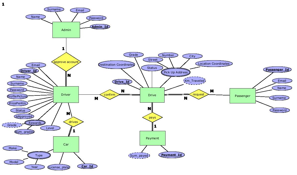 - Pays: 1:1 релација помеѓу Drive и Payment и го претставува плаќањето на превозот од страна на патниците. И Drive и Payment се со целосно учество во релацијата. За секое патување посебно имаме точно една наплата.