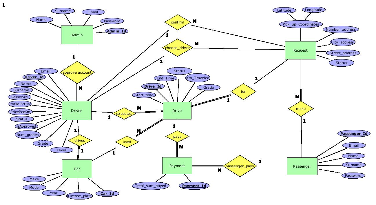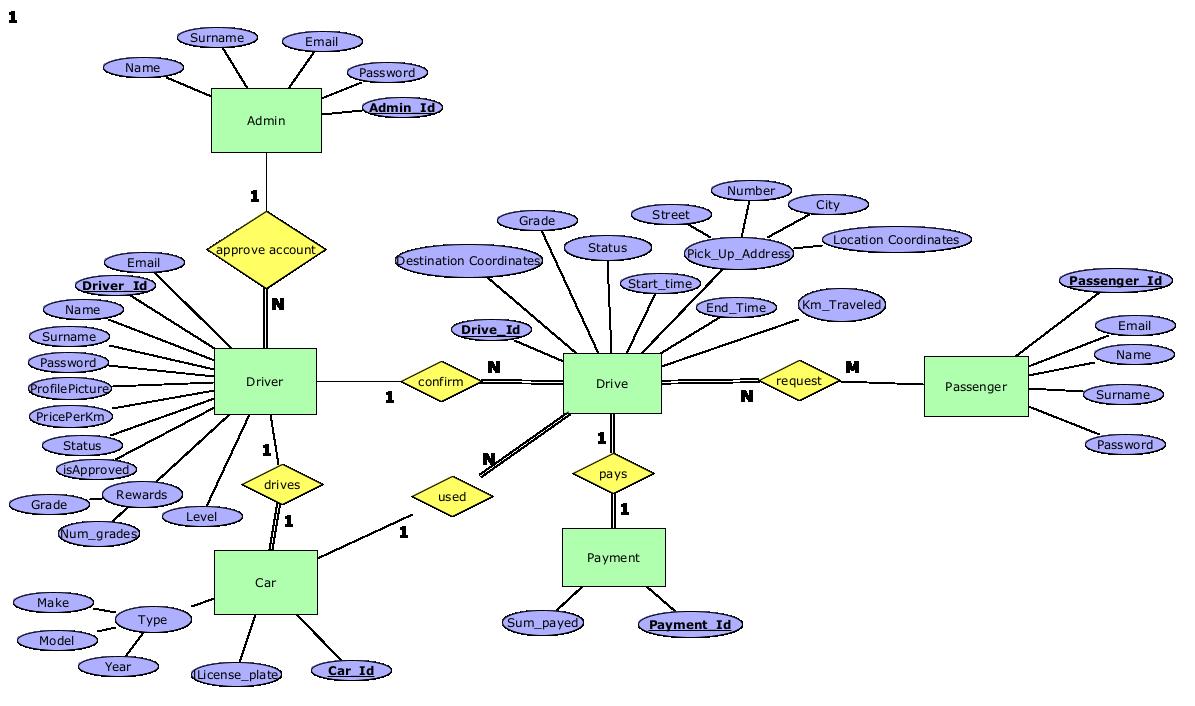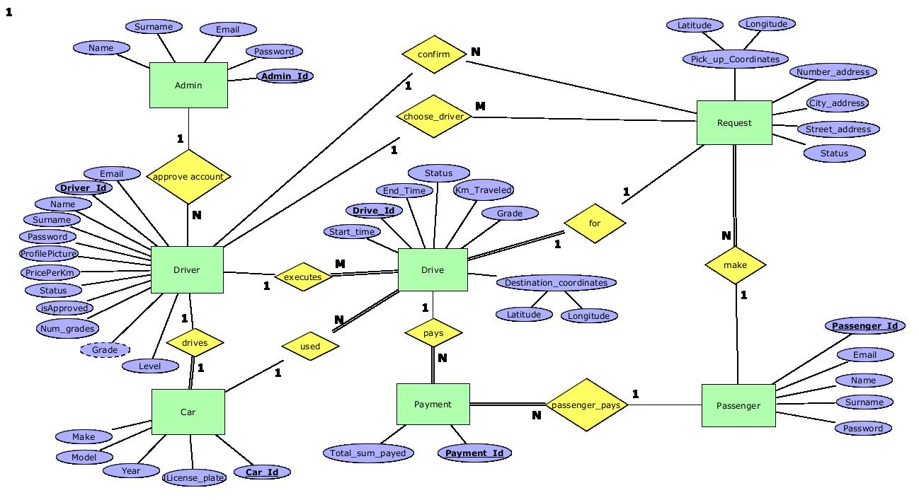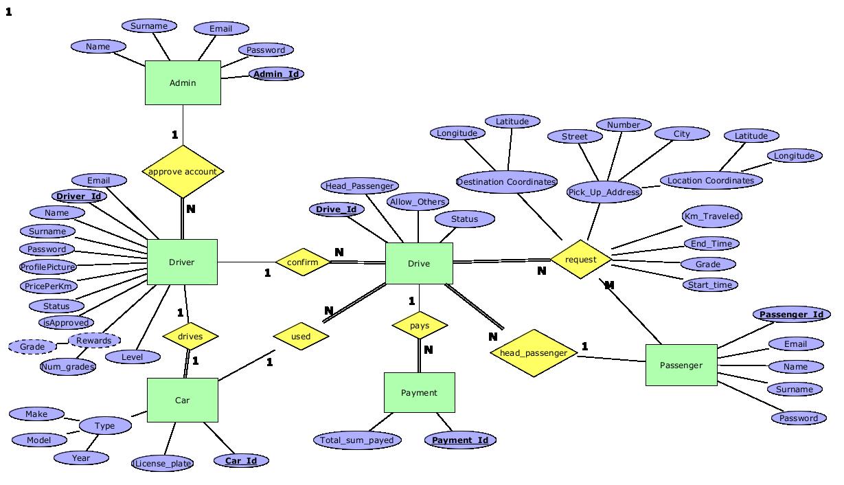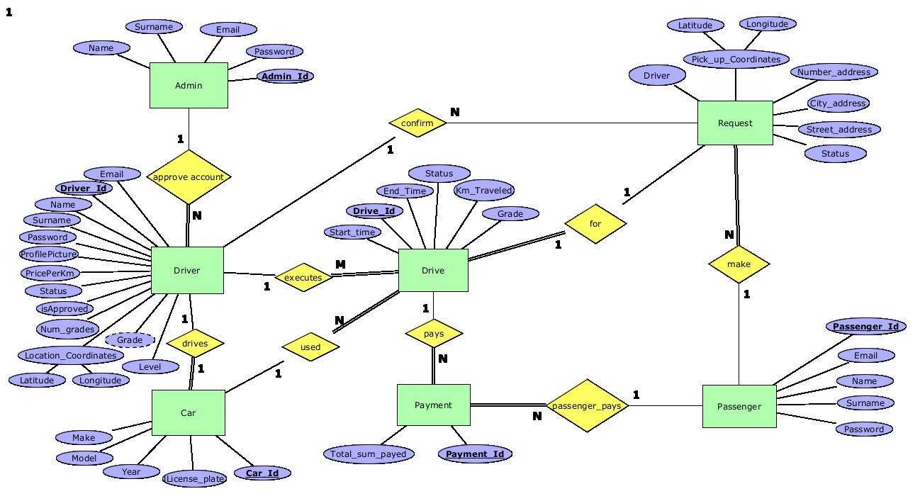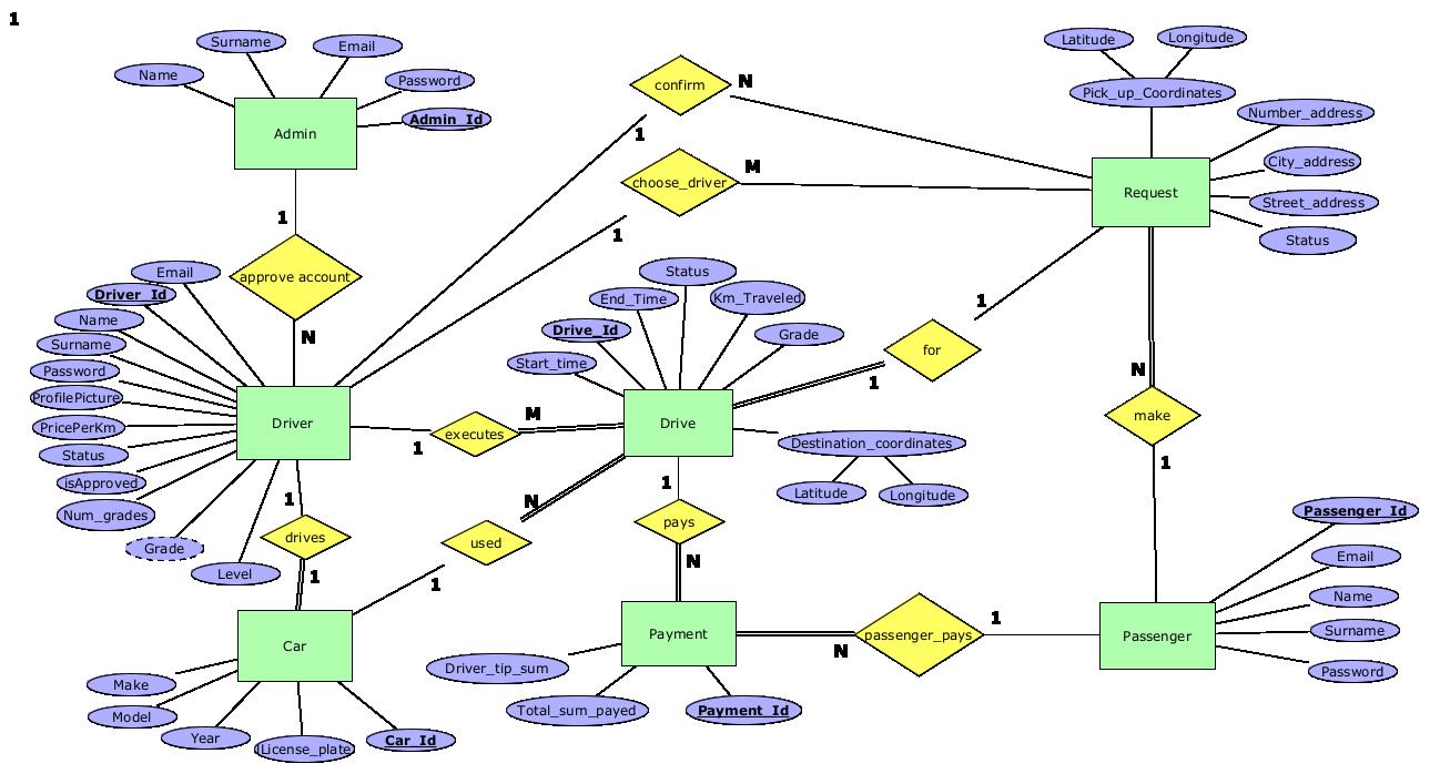 - For: 1:1 релација помеѓу Drive и Request и го претставува креирањето на патување за секое барање. Request е со делумно учество во релацијата додека Drive е со целосно учество. За секое посебно барање имаме точно едно патување.