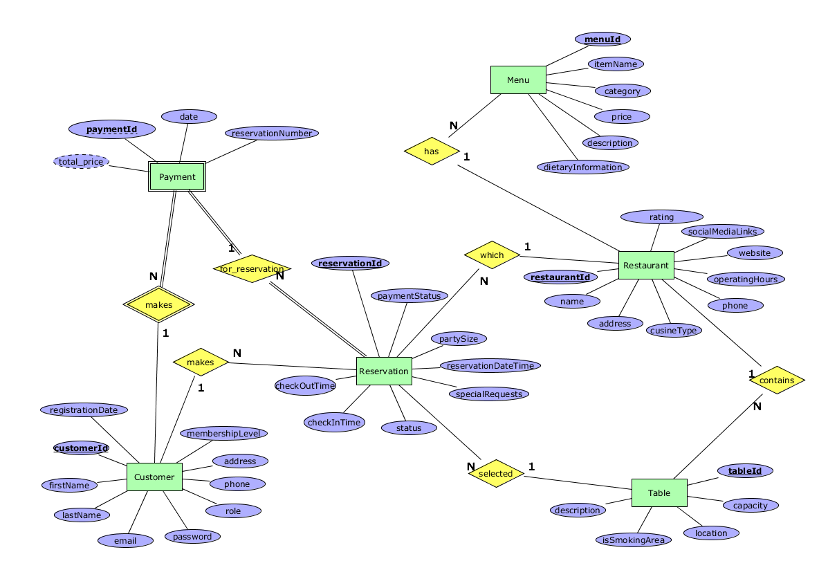Description: Represents a customer who can make reservations. Primary Key: None specified in the XML; assumed to be an ID or similar field. Attributes: Not explicitly detailed in the XML file. Entity: Restaurant