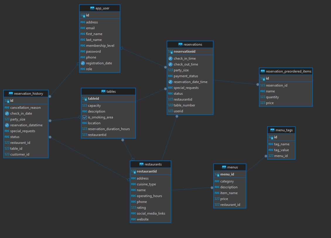 Reservation(reservationId, userId(User), tableId(TableEntity), restaurantId*(Restaurant), reservationDateTime, partySize, specialRequests, status, checkInTime, checkOutTime, paymentStatus)