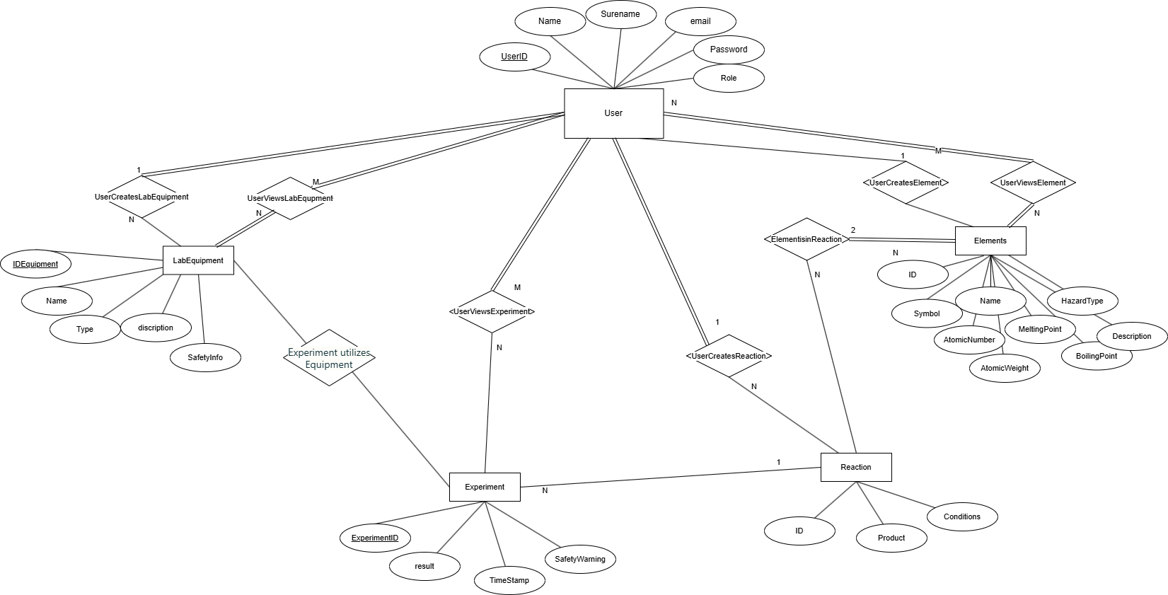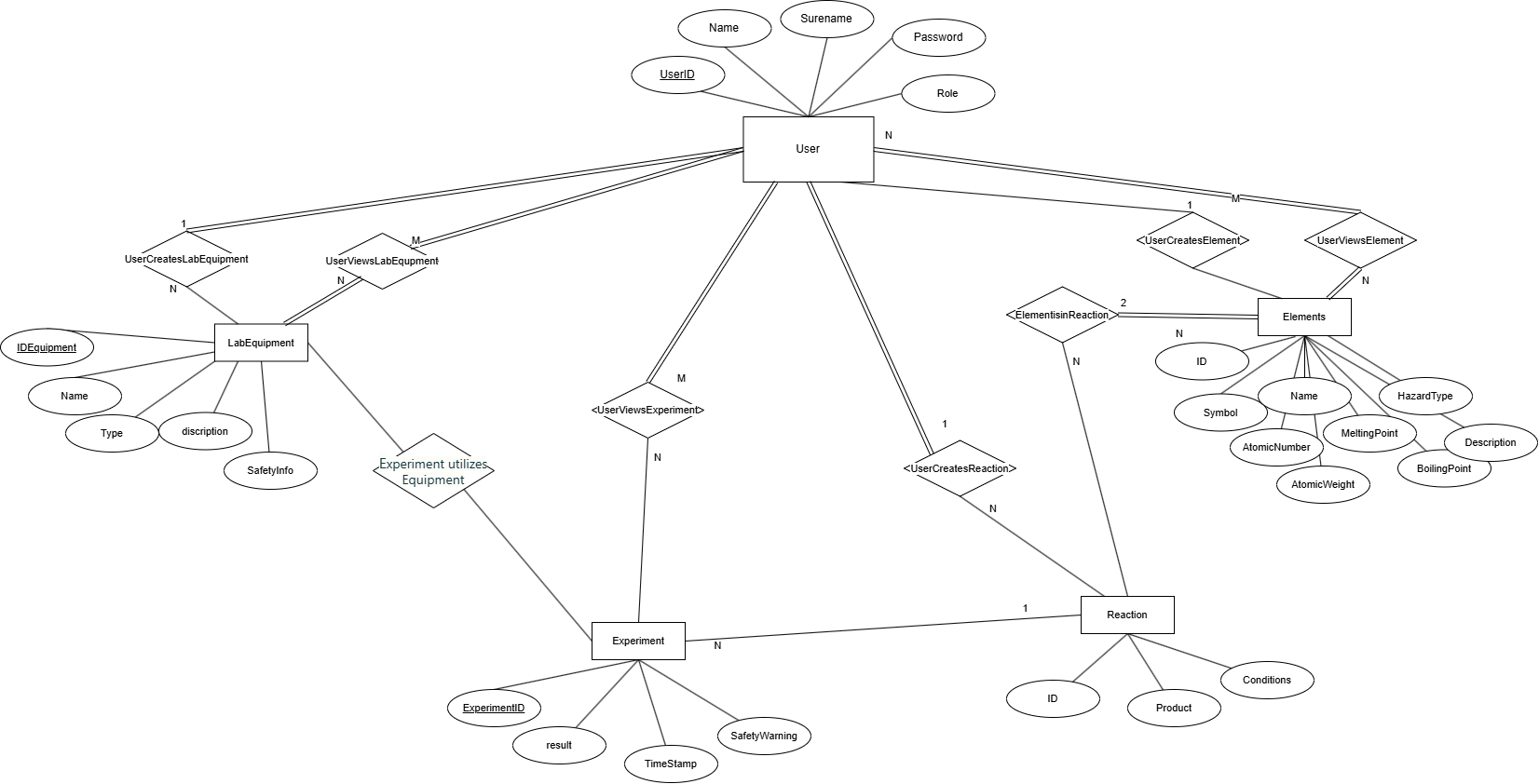 - ExperimentUsesLabEquipment – N:M еден експеримент може да користи повеќе лабораториски инструменти, а еден инструмент може да се користи во повеќе експерименти.