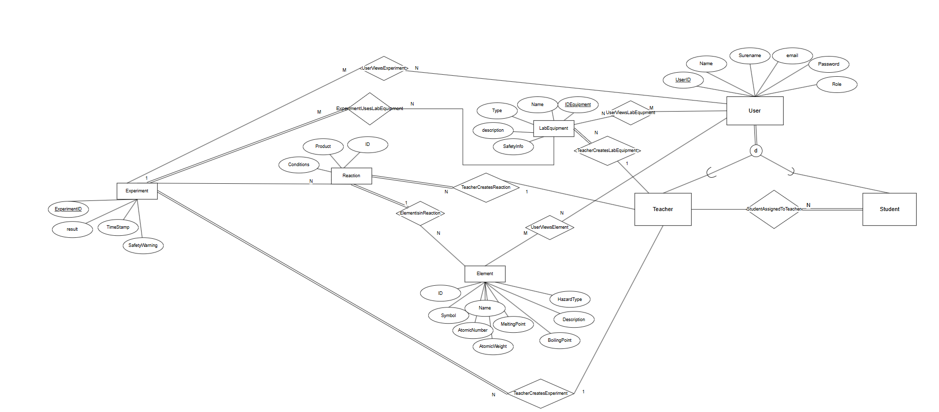 - TeacherCreatesElement – 1:N еден наставник може да создаде повеќе хемиски елементи.