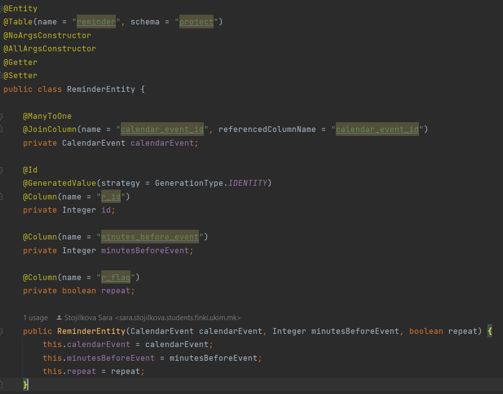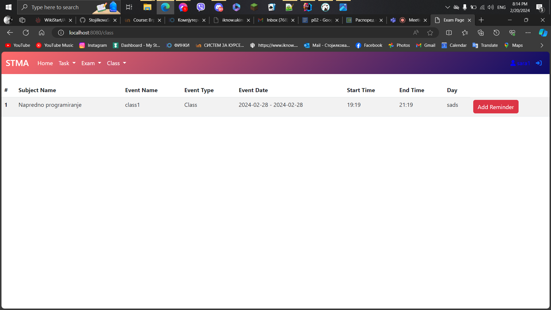 Чекор2: На корисникот му се излистани сите идни настани од типот Class. За посакуваниот час за кој сака да додаде Reminder, ја избира опцијата Add Reminder.