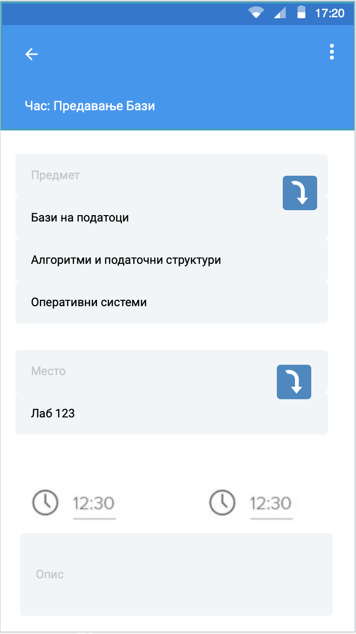 Кандидатот селектира дали часот е повторлив или ќе се одржи само еднаш и според тоа му се отвараат полиња во формата. Доколку часот е повторлив ќе му се отворат полиња за внесување од кој до кој датум се повторува часот, ден од неделата во кој се повторува часот и на колку недели се повторува часот. Доколку часот не е повторлив се отвара само поле за внесување на датум.