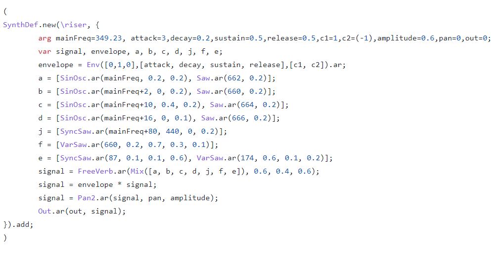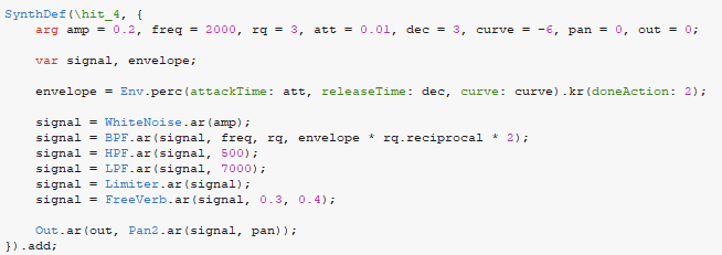 После креирањето на синхронизацијата и комбинирањето на сите потребни ритмички и мелодиски елементи, потребно е додавање на дополнителни звучни ефекти во нумерата. Тие имаат улога на додавање на поглатка транзиција меѓу секциите, додавање на повеќе контекст во одредени моменти на траката, како и додавање на мотиви коишто истовремено ја надополнуваат емоцијата, но и, додаваат стереo ширина и детали на истата, со што нумерата станува малку повеќе тродимензионална и поинтересна за слушање. Потребата од конкретни звуци од овој вид зависи многу од жанрот, стилот и насоката на музиката. За конкретниот стил на 'SYNTHesized', ставен е фокус на 3 видови на ефекти и тоа: кревачи (risers), спуштачи (downers) и звучни дизајн ефекти (sound design effects). Комплетниот изворен код за ефектите е даден во прилог, заедно со слики во кои се претставени репрезентативни примероци од енвелопата и кодот на соодветниот вид на звук.