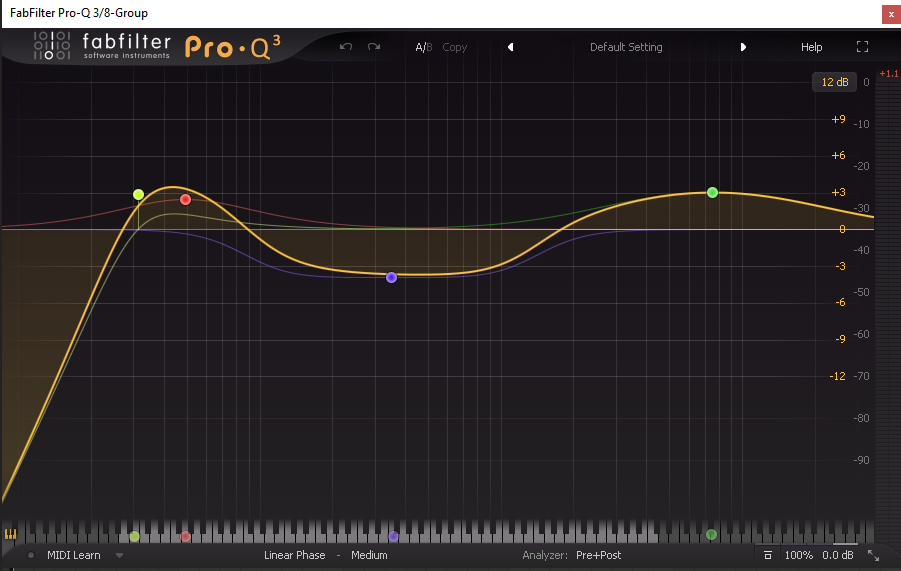На крај, на целата група за лидови, ставен е само еден Еквилајзер на кој се намалува -2.3 dB на 1.1 KHz, исто толку се појачува на 7.7 KHz, и, се кратат сите високи фреквенции над 21 KHz бидејќи нема потреба од нив. (прикажано во прилог)