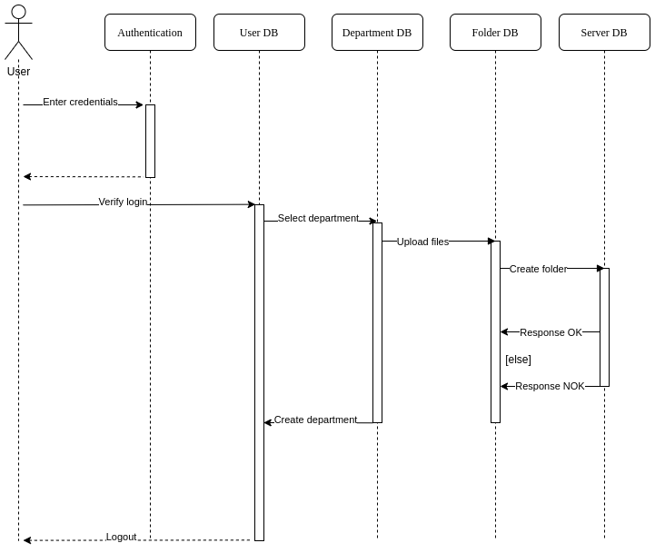 На сликата подолу е прикажан секвенцијален дијаграм за креирање на фолдер. Процесот за креирање на фолдер е следен: корисникот се најавува во системот со внесување на своето корисничко име и лозинка. Потоа ја верифицира најавата со внесување на OTP кодот кој го добива преку е-пошта. По автентикација се обидува да креира фолдер. Прв чекор е изброр на оддел. Потоа ја пополнува формата и ги прикачува датотеките. Со клик на submit се праќа барање да серверот и доколку помине валидацијата се креира фолдерот со тоа што се запишува во базата на податоци.