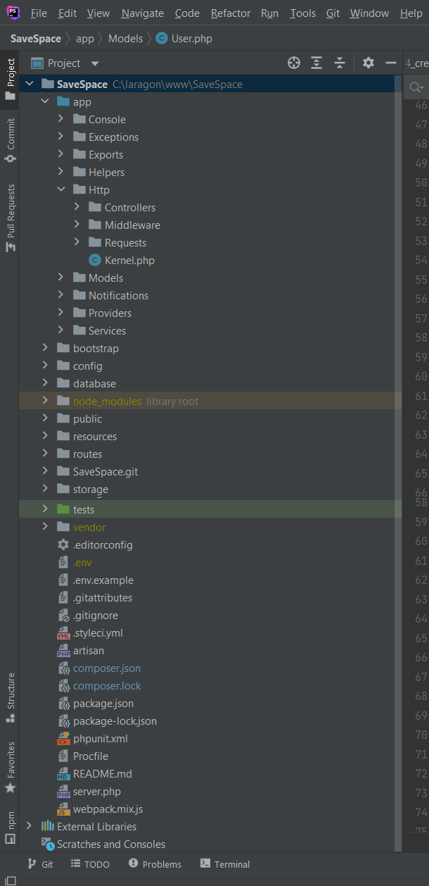 Во Laravel Root Directory се нарекува главниот директориум каде се наоѓа целиот изворен код од апликацијата. App директориумот на апликацијата го содржи основниот код на апликација. Директориумот Config, како што имплицира името, ги содржи сите конфигурациски датотеки на апликација. Database директориумот ги содржи миграциите на базата на податоци, вредностите кои се запишуваат за моделот и семиња за тестирање на датабазата. Public директориум ја содржи датотеката index.php, која е влезна точка за сите барања што влегуваат во апликацијата и го конфигурира автоматското вчитување. Во овој директориум се сместени и сликите како и интерфејсите на апликацијата.