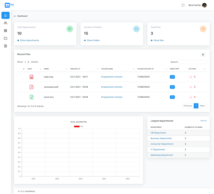 По успешна најава на корисникот му се појавува почетниот екран од админ панелот Dashboard. На оваа страница има детали за сите оддели, фолдери и датотеки како и линкови до нивните страници. Исто така подолу може да се види и табела каде се листаат нај ново внесените датотеки од било кој корисник. Под табелата се прикажува граф т.е. canvas во кој се прикажува колку датотеки се внесени секоја година за да може да се спореди ефикасноста и користењето на апликацијата. До графот има листа во која се прикажуваат десетте оддели со најголем број на фолдери т.е. документи подредени.