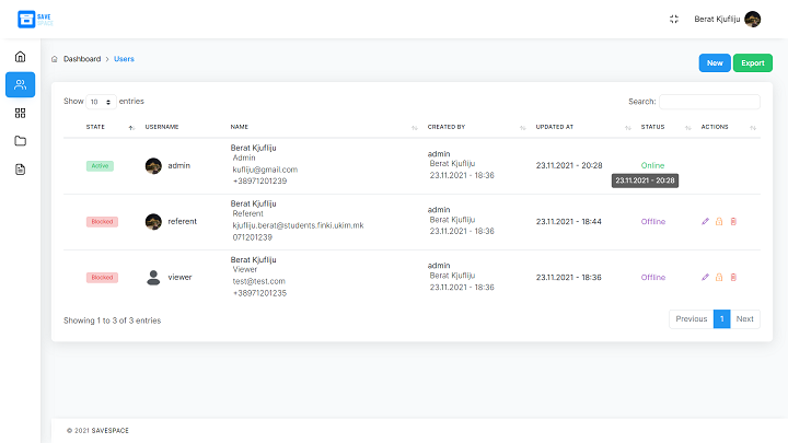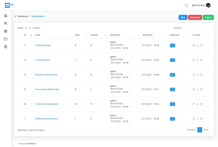 Преку навигацискиот панелот корисникот може да пристапи до листата со корисници, оддели, фолдери или датотеки. Секој модул има посебна страница. Во страницата каде се излистани сите корисници користев DataTables, [16] флексибилна алатка, прогресивна, која додава и овозможува различни функции и функционалности на HTML табела. Може да се забележи и преку сликата подолу дека сите податоци може да се филтрираат како и да се пребарува по сите параметри. За секој корисник во еден ред се прикажува статусот, слика од профилот и корисничкото име, податоците за неговиот профил и информации дали е активен и од кој корисник бил креиран. Во делот за акции администраторот има можност преку модал да ги менува податоците за профилот на корисникот, да го менува статусот на корисникот или да го избрише.