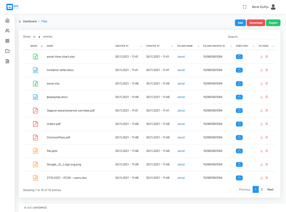 Освен тоа што може корисникот да додаде датотеки во еден фолдер преку страницата за приказ на фолдери исто така тој има можност да додаде датотеки и преку страницата за управување со датотеки во која се прикажуваат сите датотеки без разлика во кој фолдер припаѓаат. На истата страница се прикажуваат сите податоци за датотеките во редови и линк до фолдерот т.е. документот во кој тие припаѓаат. Корисникот има можност да ја симне или избрише датотеката и исто така во горниот дел се копчињата за додавање на датотеки преку модал во кој се бира фолдерот и се додаваат датотеките како и копчињата за симнување на zip со сите датотеки структурирани според начинот на зачувување во сервер и копчето за симнување на excel датотека која ја содржи табелата за датотеки.