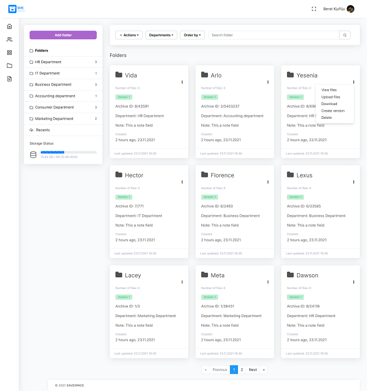 Веднаш под модулот за оддели се наоѓа модулот за фолдери. Тука структурата на приказ на податоци е малку различна. Наместо HTML табела користев Bootstrap Cards [17] кои се користат како флексибилни и проширливи контејнери за содржини. Модулот за фолдери има дополнителен навигациски панел каде што се прикажуваат сите оддели со бројот на фолдери во нив. Секој елемент има линк кој води до одреден оддел каде што се излистани само фолдерите од тој оддел. Во долниот дел се прикажува зафатеност на апликацијата во сервер. Во десниот контејнер се наоѓаат копчињата за креирање на нов фолдер како и копчето за симнување на табелата од база. Во истата секција има можност за сортирање на фолдери според има (по азбучен редослен), по датум на креирање (најновите-први) како и по број на датотеки во нив. Исто така постои и можността за пребарување на фолдерите по име и архивски број. При секое пребарување се филтрираат фолдерите според критериумот. За секој фолдер се прикажуваат следните податоци: име, број на датотеки, верзија, архивски број, име на одделот, забелешка, време на креирање и време на последно ажурирање. З секој фолдер има акција за преглед на датотеки (води до страницата каде се листаат датотеки само од избраниот фолдер), прикачување на нови датотеки преку модал, симнување на сите датотеки за избраниот фолдер, креирање на верзија преку модал каде се препополнети името и ахивскиот број како и бришење. Фолдерите се листаат по страници. Секоја страница содржи највеќе 9 фолдери.
