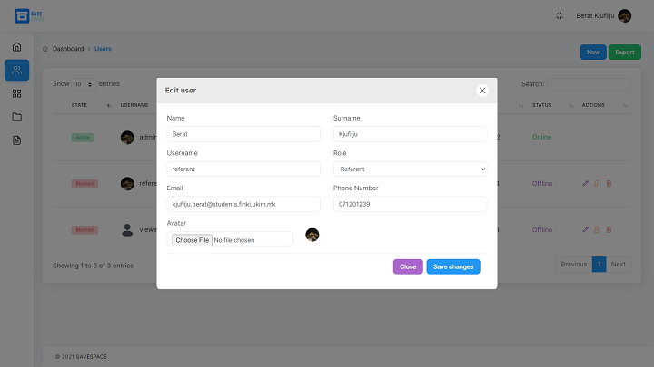 Додавањето на нов корисник или уредувањето на корисничките податоци исто така се врши преку тригерирање на модал во кој има форма која треба да се пополни според валидациските правила дефинирани претходно. До копчето за додавање на корисник над табелата има и копче преку кое се симнува excel датотека во која се запишани сите податоци за табелата за корисници во база.