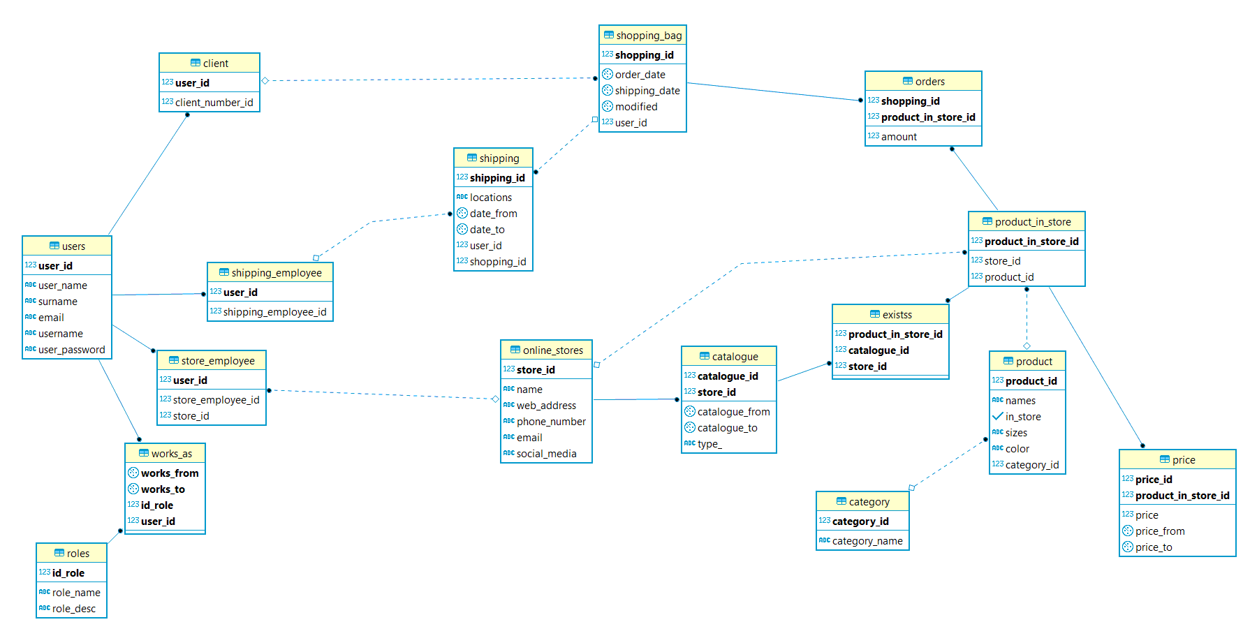 Store_employee(user_id*(user), store_employee_id, store_id*(online_stores))