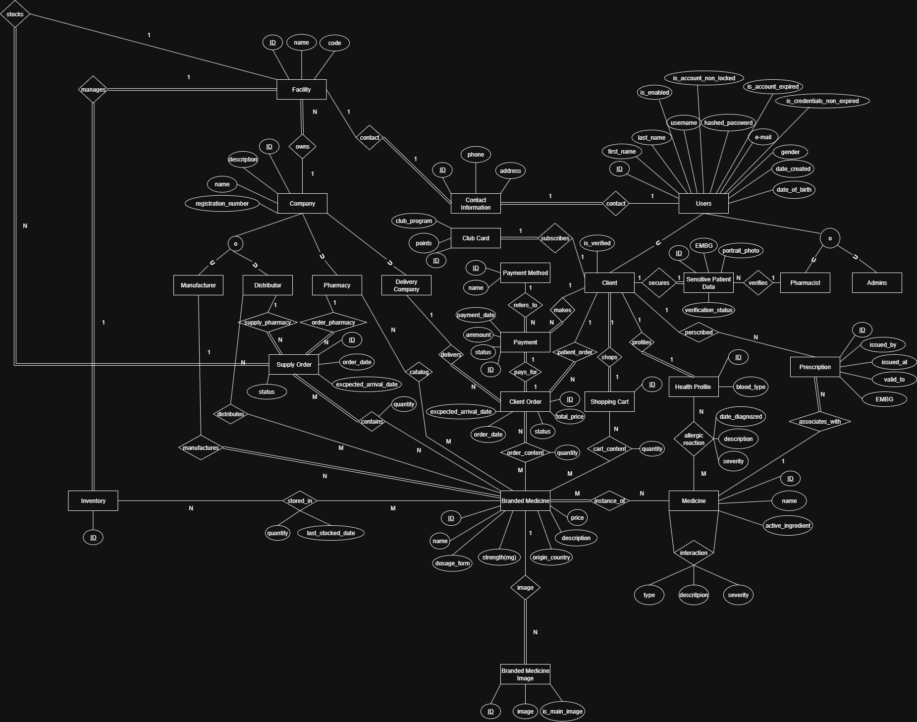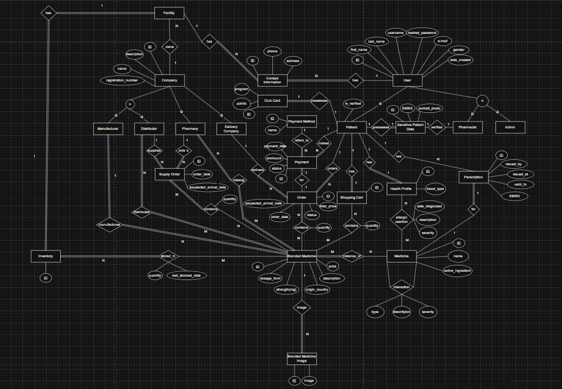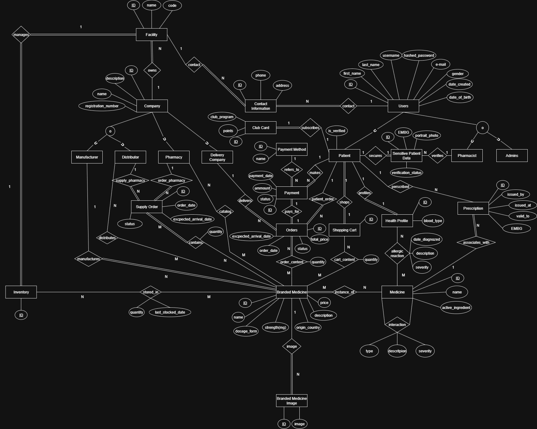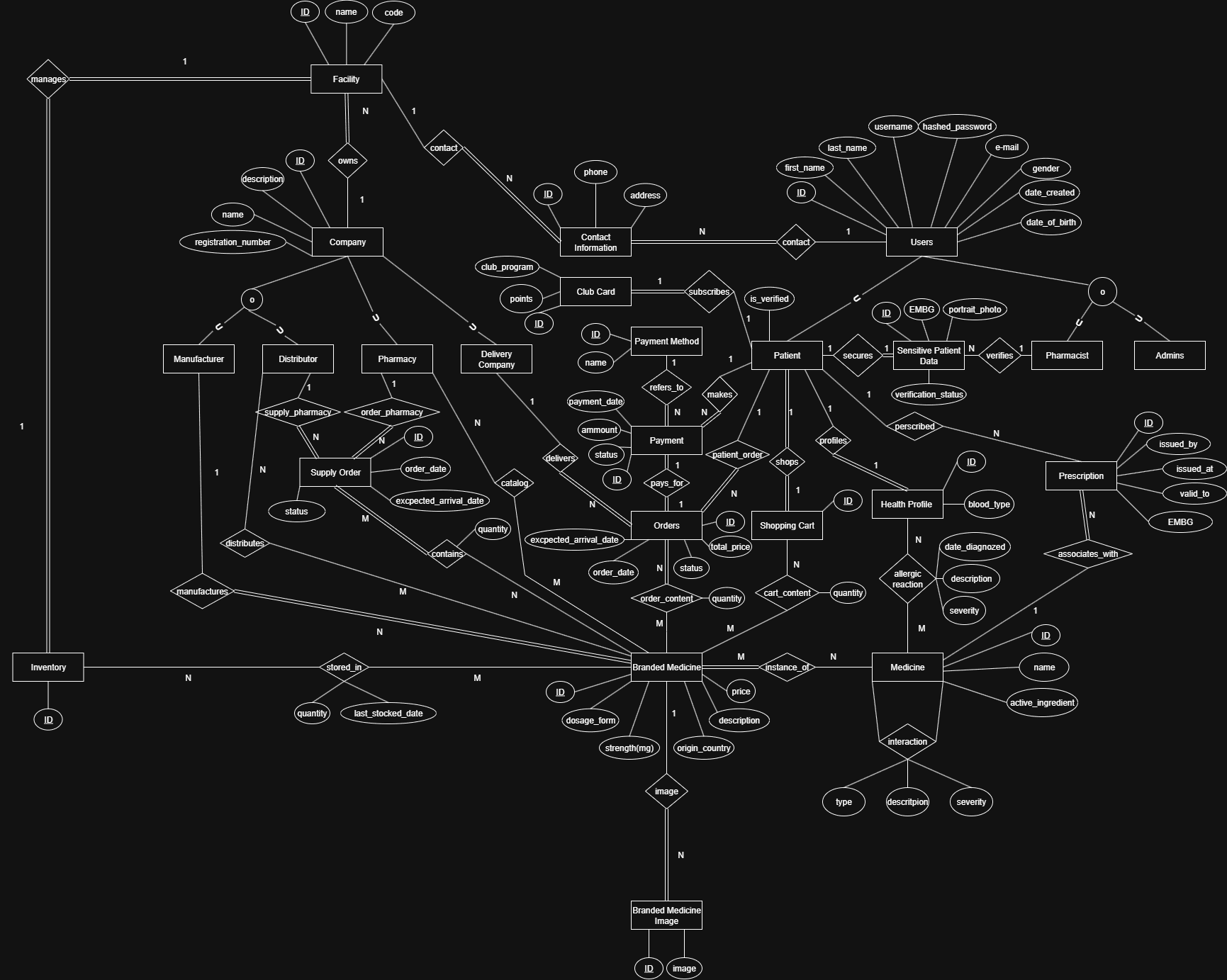 - distributes - N:M релација измеѓу Distributor и Branded Medicine, каде што еден брендиран лек може да е дистрибуиран од страна на повеќе дистрибутори, и еден дистрибутор може да дистрибуира повеќе брендирани лекови.