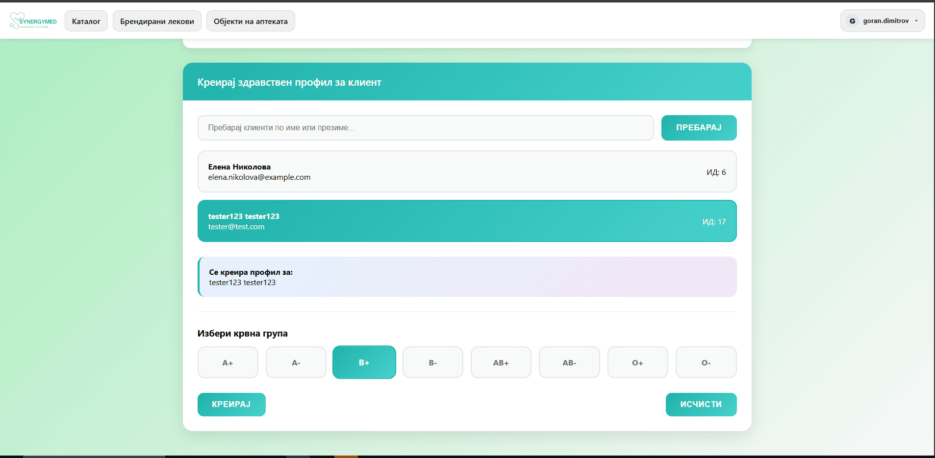 - Фармацевтот избира клиент, избира крвна група на клиентот и клика на копчето „Креирај“.