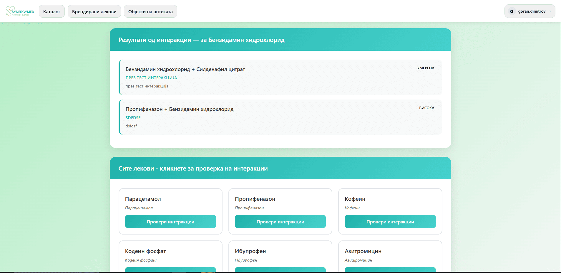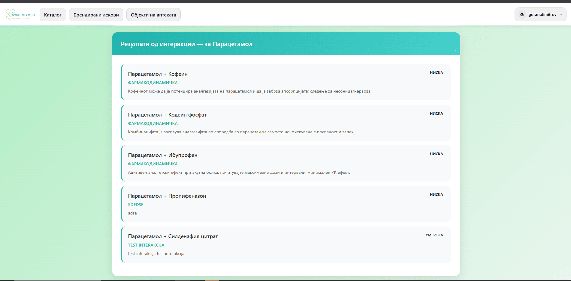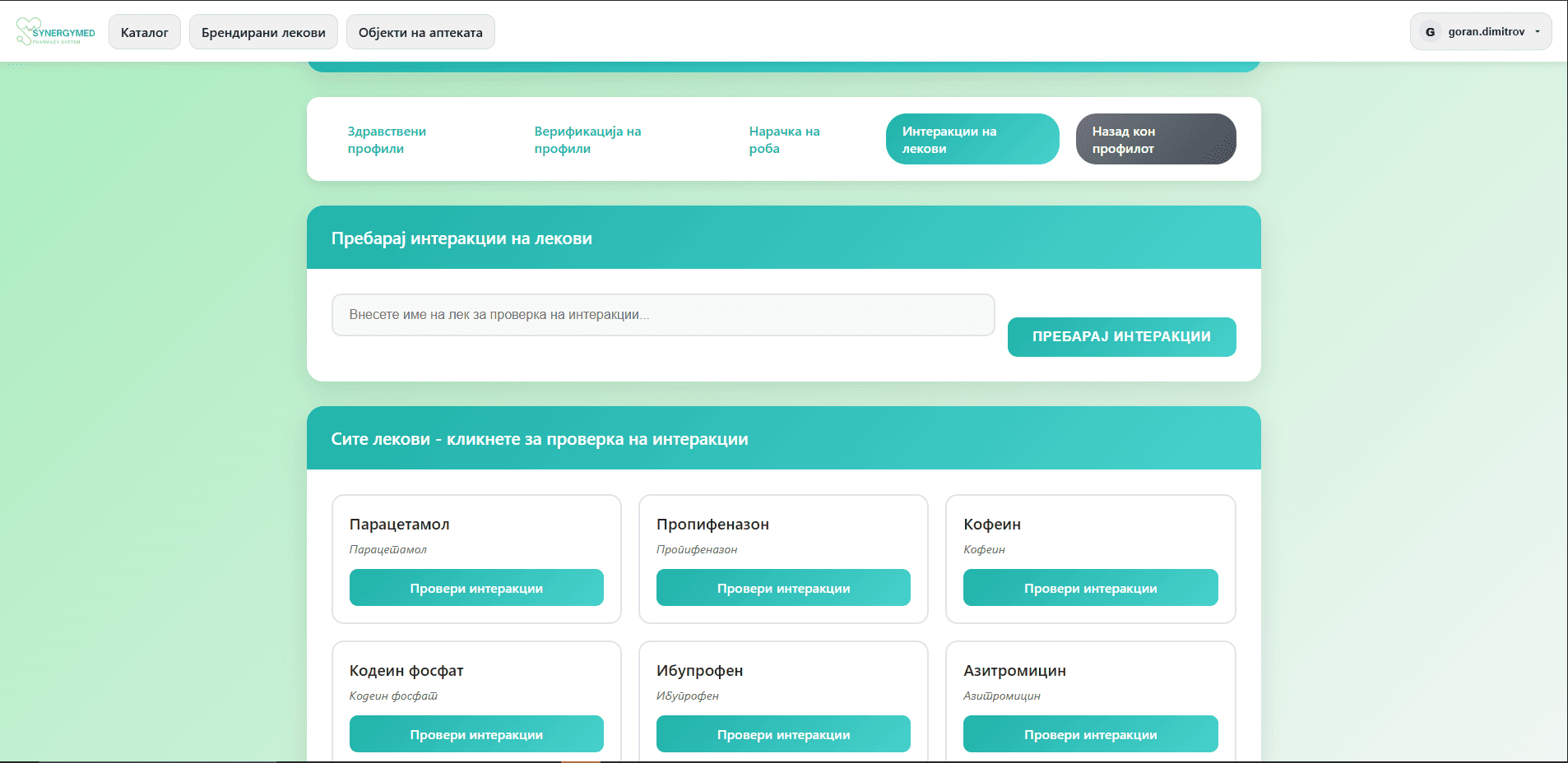 - Се вчитува страна со сите лекови кои ги има во системот, може да се пребара конкретен лек, или да се кликне на лек да се видат неговите интеракции со други лекови. Има и копче за креирање на нови интеракции.