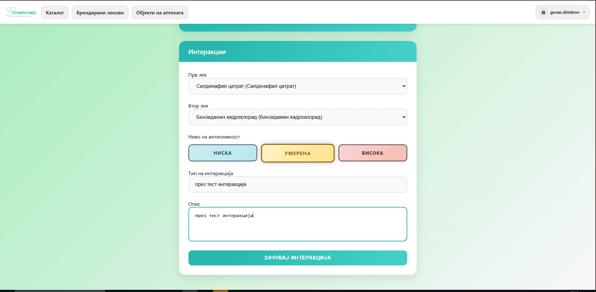 - Фармацевтот клика на копчето креирај по што се прикажува форма за креирање на интеракција меѓу лекови.