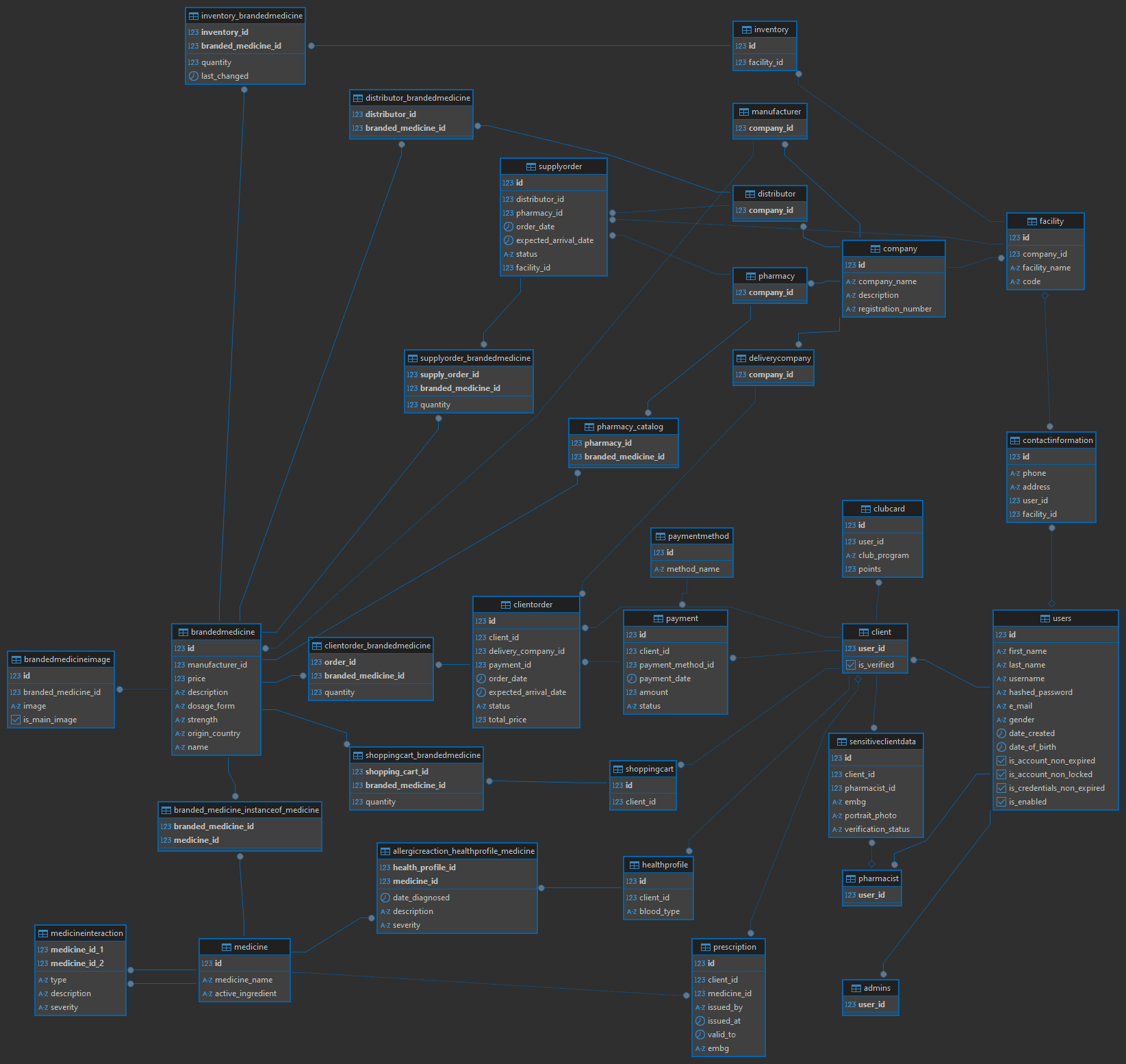 - ClientOrder_BrandedMedicine (order_id*(ClientOrder), branded_medicine_id*(BrandedMedicine), quantity)
