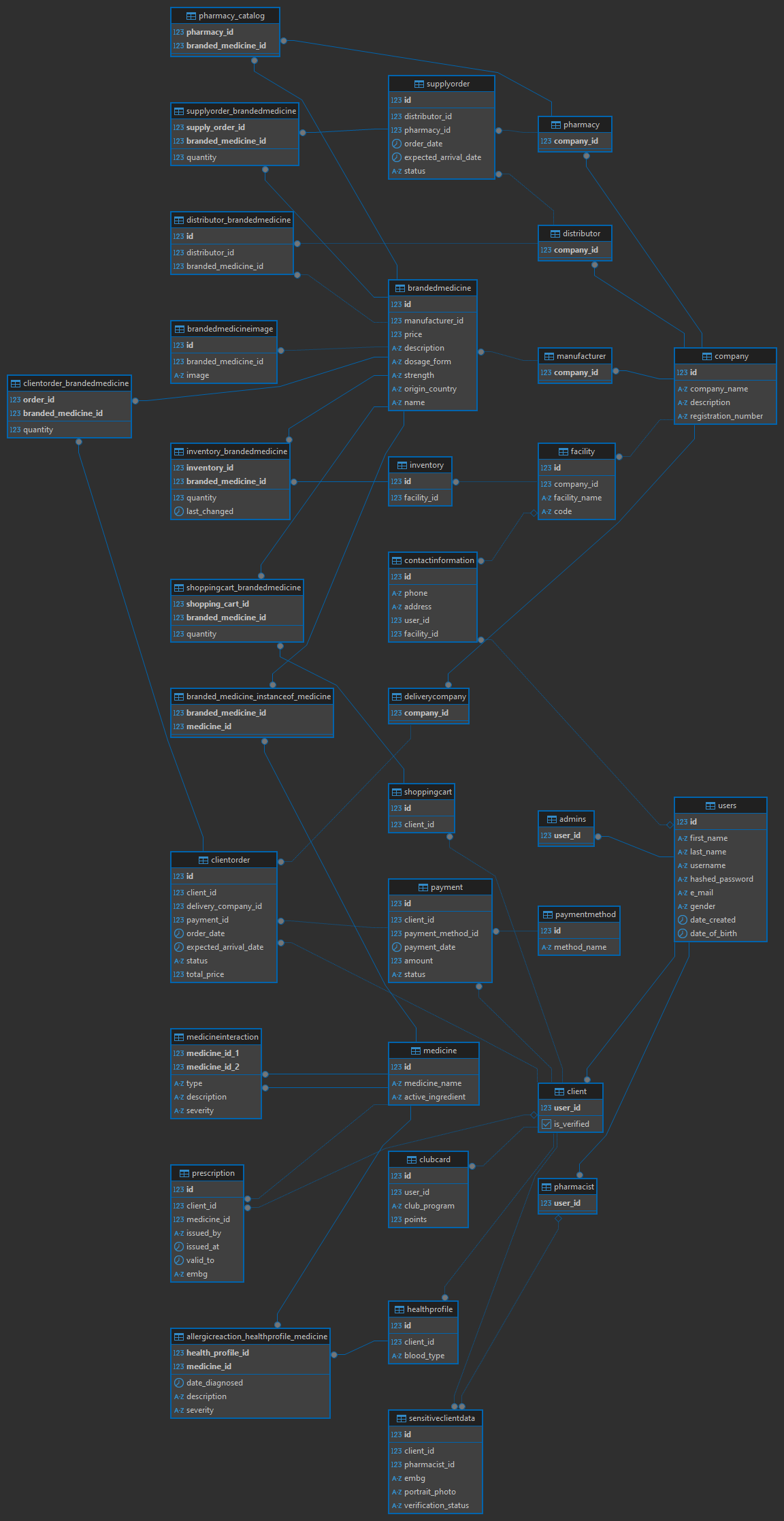 - ClientOrder_BrandedMedicine (id, order_id*(Order), branded_medicine_id*(BrandedMedicine), quantity)