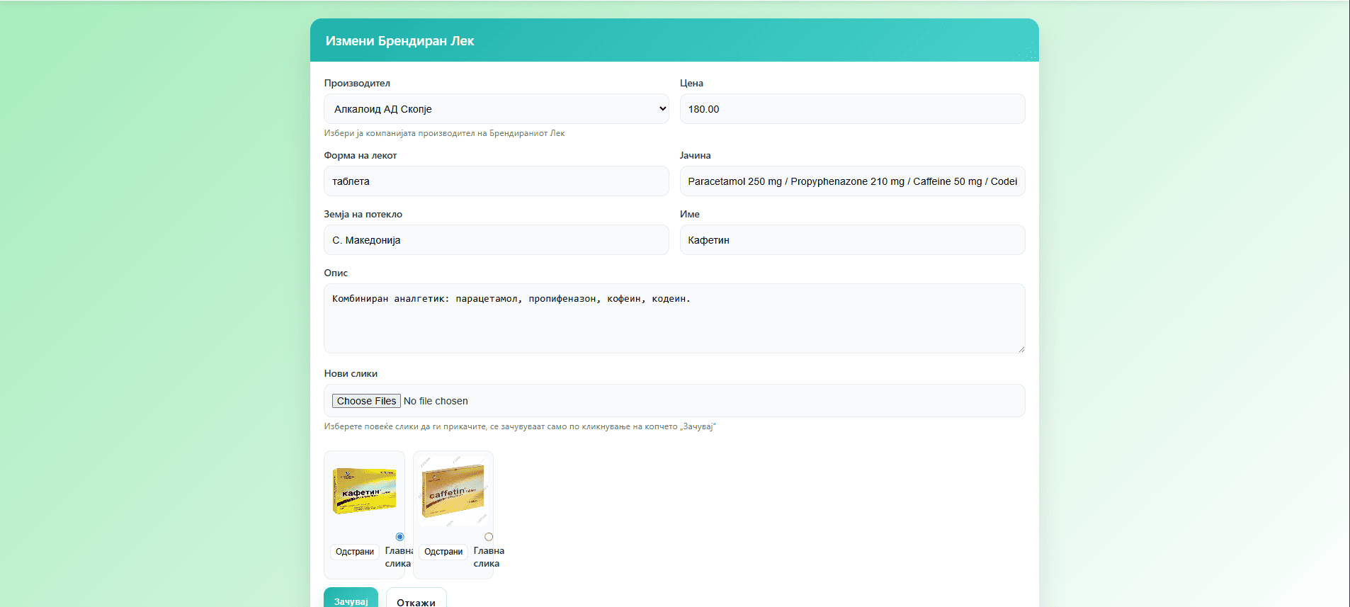 - Администраторот/Фармацевтот може да креираат нов лек или да изменат постоечки лек.