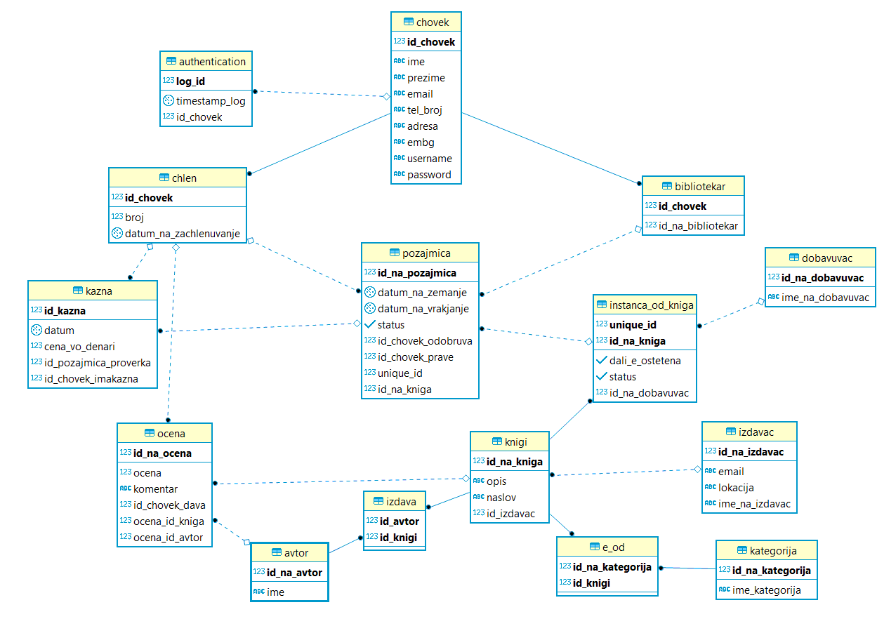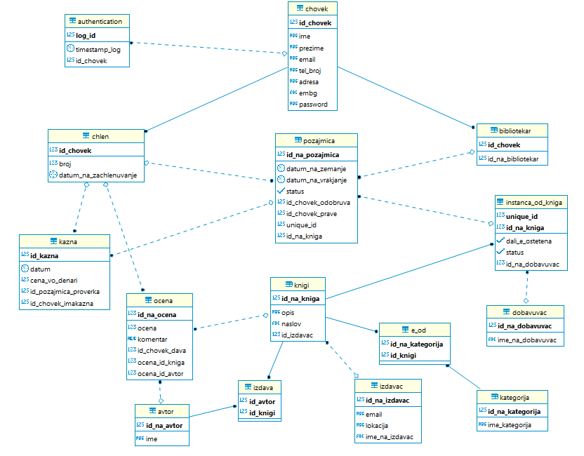 Bibliotekar(id_chovek*(Chovek), id_na_bibliotekar)