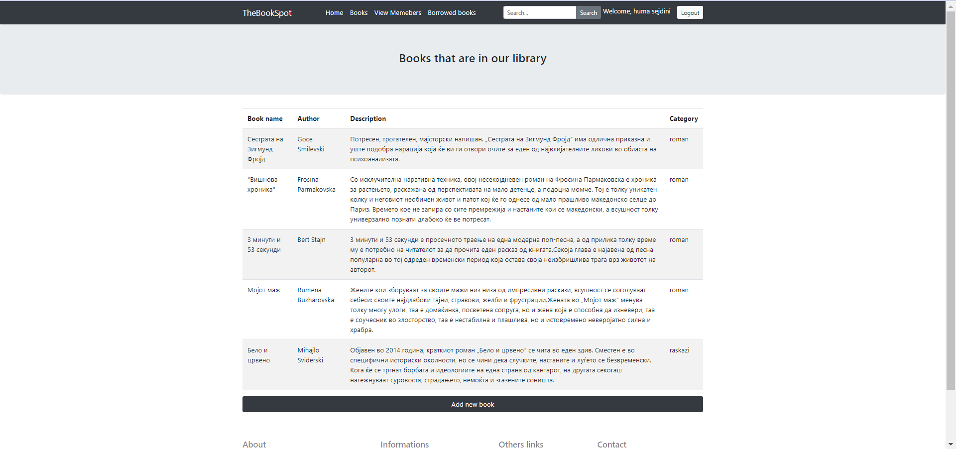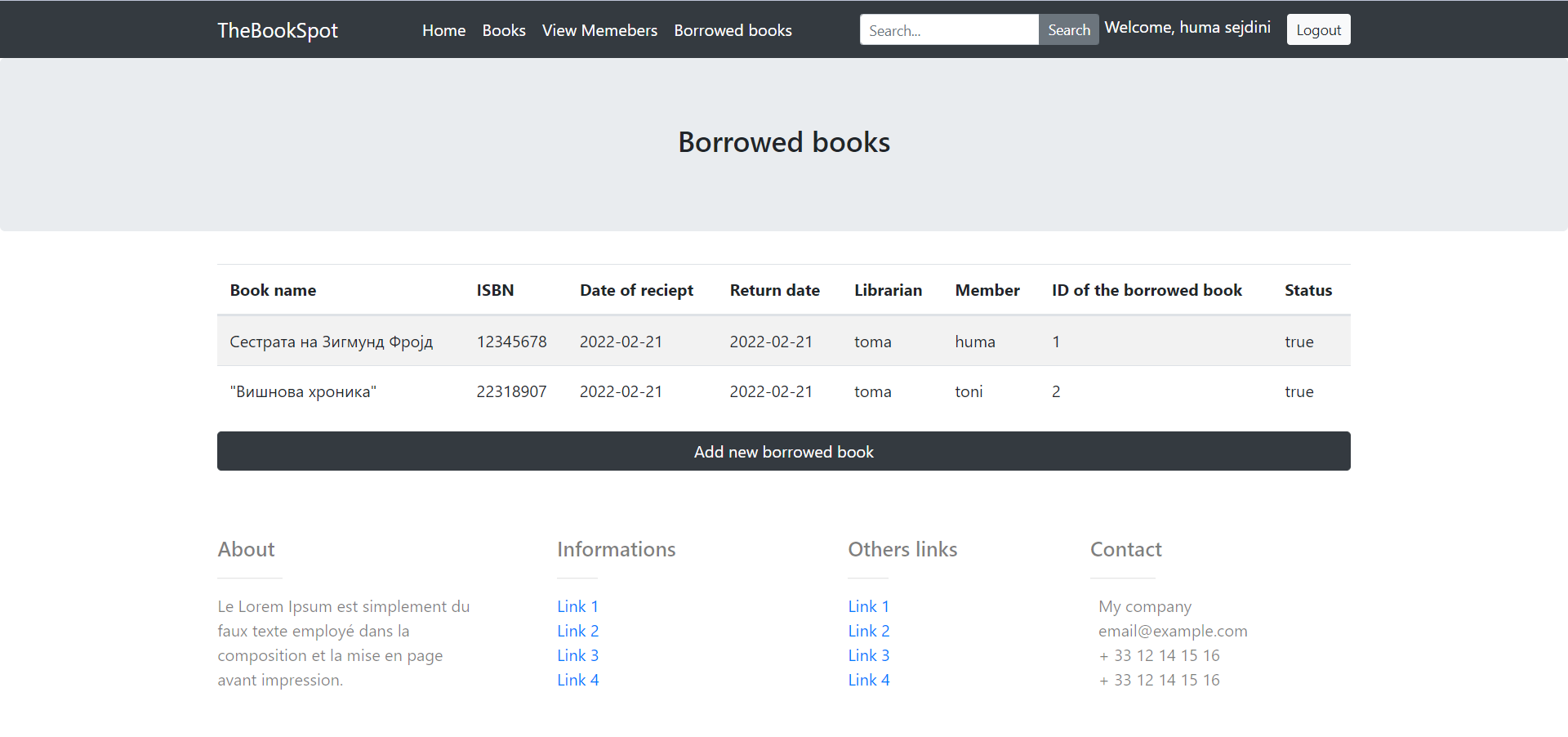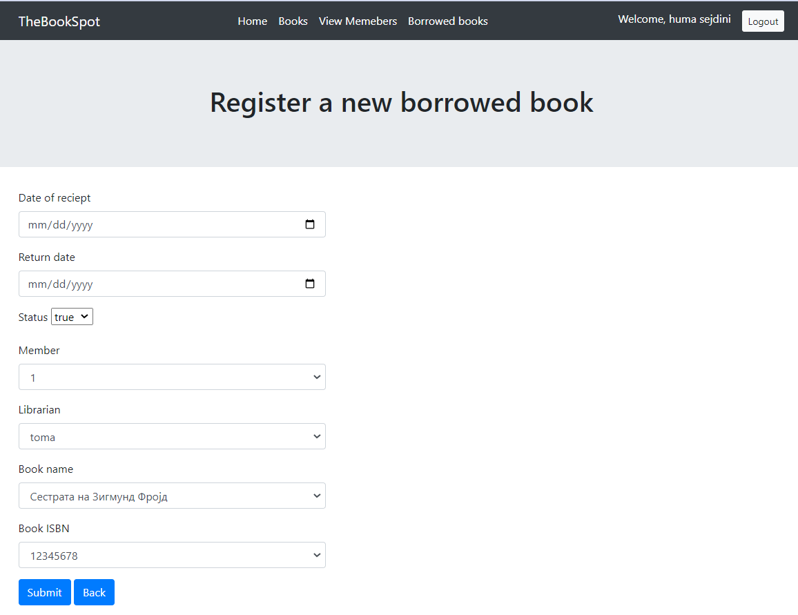Исто така е овозможено приказ на html форма за додавање нова позајмена книга