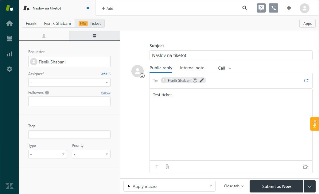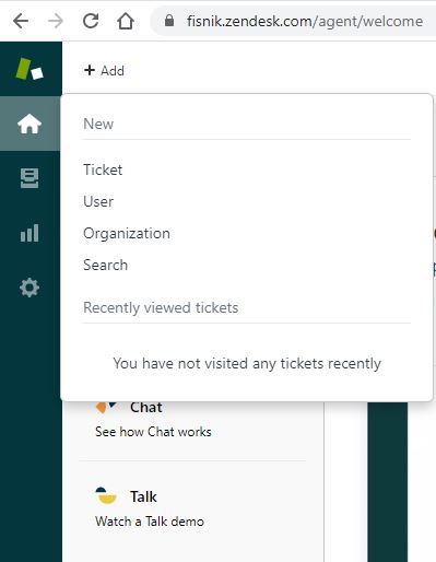 Zendesk додавање нов тикет, корисник, организација