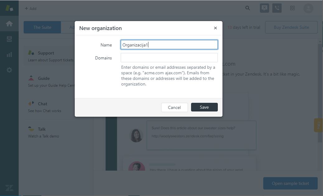Zendesk додавање нова организација
