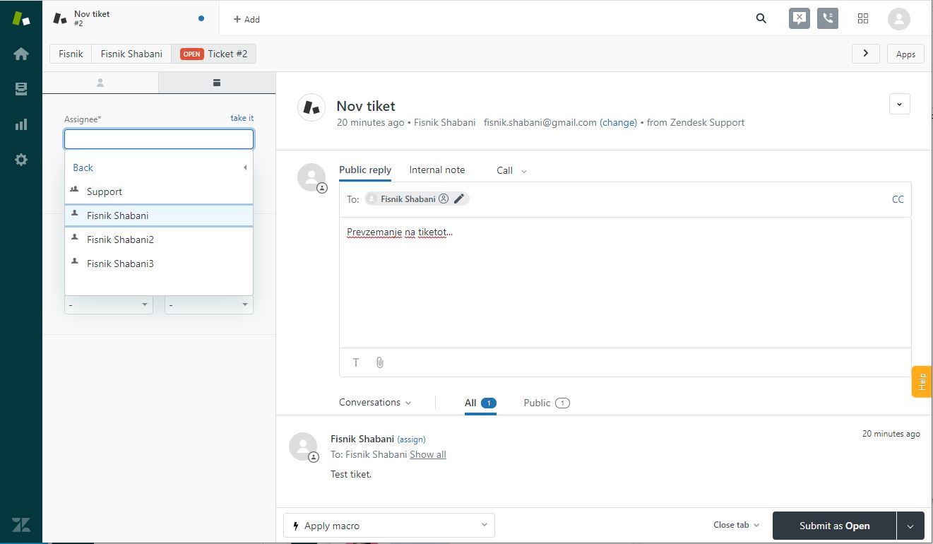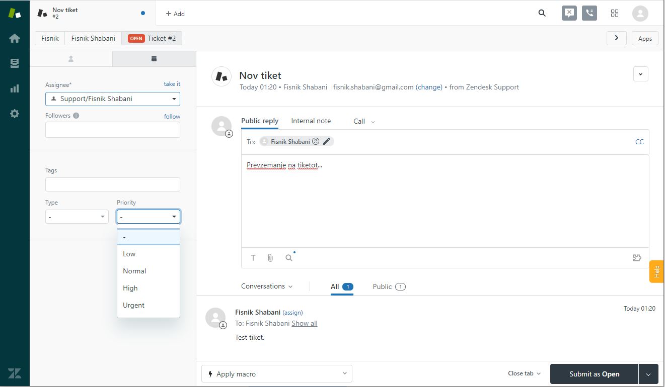 Можните акции врз тикетот се: превземање, одговор на истиот, доделување до друг агент/администратор, зачувување како сеуште отворен, во тек или затворен тикет. Во делот Assignee* може да доделите тикет до друг агент, потоа во делот Type и Priority можете да одберете тип на тикет и приоритет соодветно.