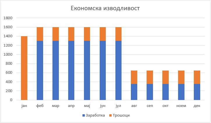 | Вкупни трошоци | 1400 | 300 | 300 | 300 | 300 | 300 | 300 | 300 | 300 | 300 | 300 | 300 |