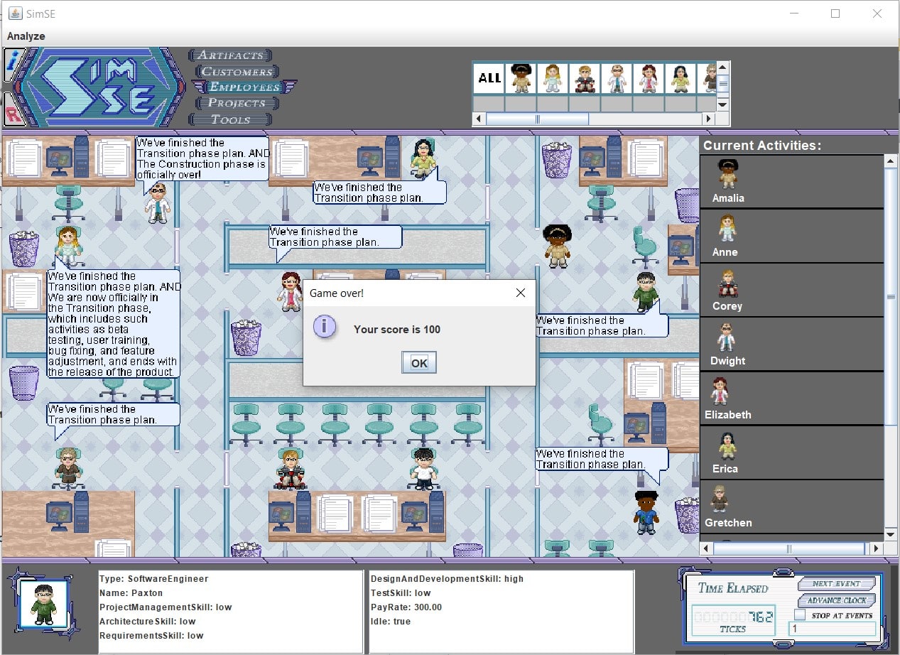 Во оваа фаза ги избрав Anne, Dwight, Elizabeth, Erica, Gretchen, Paxton, Tai поради нивните комбинирани Design and Development skills, Testing Skills, Architectural skills, Project management skills. Во оваа фаза во првата итерација изравботив беа направени design and implement component, integrate and test за половина од вкупниот број на use cases, така што вработените паралелно работеа на 2 use cases и беше доставен прв прототип. Ова траеше од 423 до 580 tick, беа потрошени 542 500 долари и клиентот сметаше дека сме импплементирале повеќе функционалности отколку што е потребно.Во втората итерација ист беше принциот на работа со тоа што ги изработуваа остатокот од use cases. Потоа го доставив втор прототип. Ова траеше од 580 до 744 tick. После тоа, им кажав да ги изработат упатствата за користење на корисници и да направат assessment на construction phase. Се заклучи дека системот ги содржи 100% од use cases. Ова траеше од 744 до 756 tick.На крај им кажав да направат transition phase plan и со тоа оваа фаза заврши на 762 tick и со потрошени 1 050 900 долари и 2 итерации.