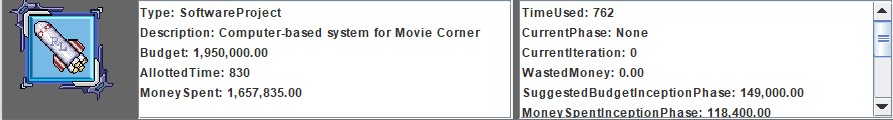 Anne и Correy ги одбрав за оваа фаза бидејќи имаат Project Management skills и Requirements skills кои се најпотребни за Inception phase, каде треба да се направат requirements document итн. Во првата итерација им дадов задача Meet with customer for requirements, која како резултат пронајде 20 use cases и траеше од 0 до 62 tick со 49 600 долари потрошени. Потоа им дадов задача да направат assessment на Inception phase, каде беа use cases беа 20% завршени . Ова траеше од 62 до 108 tick со 86 400 долари потрошени. Потоа им кажав да направат Elaboration phase plan, тоа траеше од 108 до 148 tick, со 118 400 потрошени долари, што е под буџетот од 149 000 долари предвидени за Inception phase.Во оваа фаза имаше само 1 итерација.
