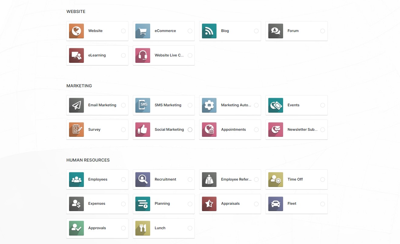 -Odoo е ERP платформа со отворен код напишана во Python, која вклучува и модул за градење веб-страници.Постојат над 35 основни Odoo модули или odoo апликации, кои покриваат широк спектар на деловни функции, од производство, инвентар и сметководство, до продажба, е-трговија, човечки ресурси итн. Како клиент, ова ви дава многу моќ во вашата имплементација. Можете да ги изберете апликациите кои се најрелевантни за вашиот бизнис и да ги купите и имплементирате. Сите модули работат функционално заедно, давајќи ви пристап до еден кохезивен ERP систем. Не само што odoo апликациите го прават Odoo лесен за користење, туку го прави и исплатлив бидејќи ги избирате само модулите што се потребни за вашата компанија. Понатаму, можете да поставите правила за пристап, така што вработените имаат пристап само до деловите релевантни за нив (на пр., маркетингот има пристап до маркетинг модулите, продавачите до продажбата, сметководителите до сметководството итн.). Ова ја подобрува безбедноста на вашиот систем. Server-side Programming Language:Python Client-side Programming Language:JavaScript