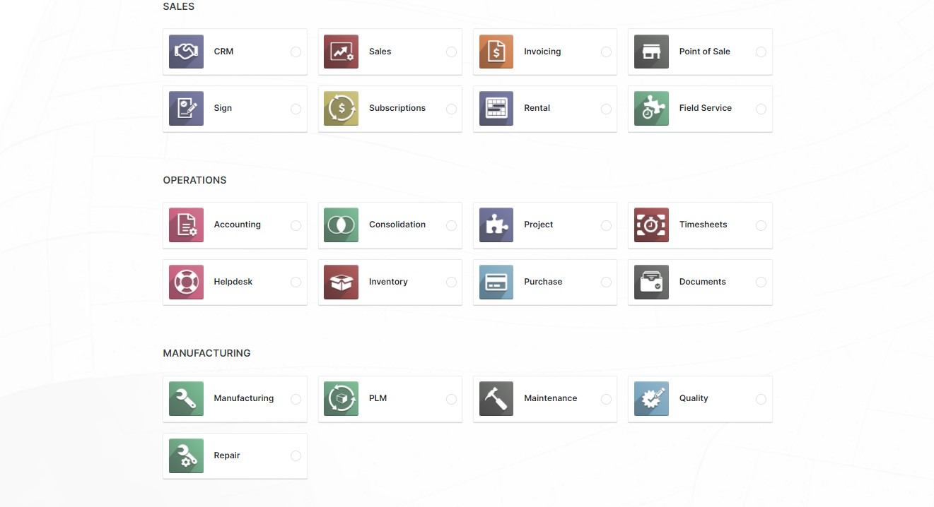 Демо верзијата, која ние ја користевме, е најлесна за пристап, со тоа што само се прави корисничка сметка и се кликнува на кошчето Try it Free!. После тоа само одбирате кои од многуте модули кои што ги понудува Odoo сакате да ги испробате и тоа е тоа.