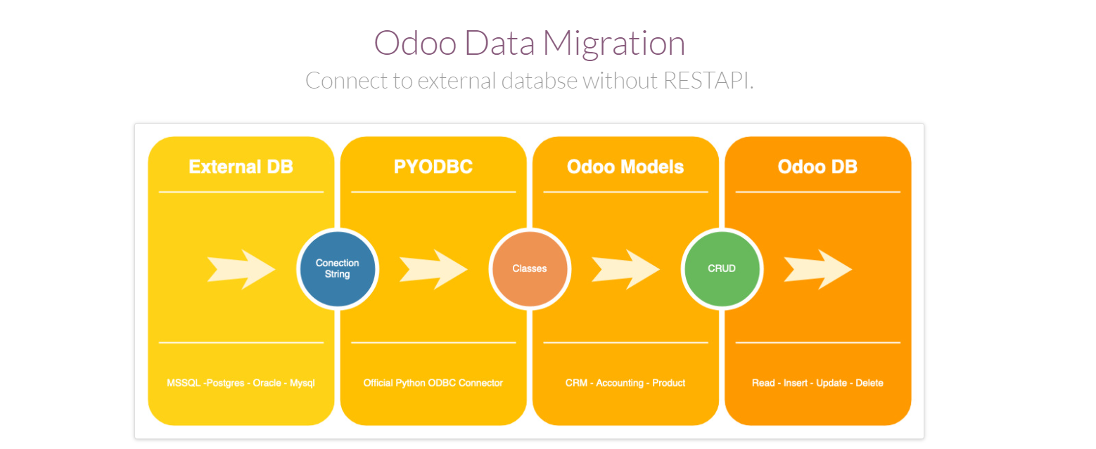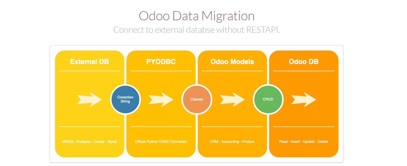 Користејќи го овој модул, можете да ги префрлите вашите податоци од стариот систем во базата на податоци на Odoo без RESTAPI користејќи директна врска со базата на податоци. Овој модул ќе го изврши процесот на миграција на професионален начин користејќи објекти на моделот, покрај тоа, можете да ги користите и двата системи (вашиот тековен систем и Odoo) заедно со синхронизирање на Odoo со вашиот стар систем, ова може да се направи со дефинирање на работните задачи за миграција. да ги копирате клиентите\продавачите\производите\inices\.. податоците во odoo врз основа на дејствата на распоредот на Odoo.