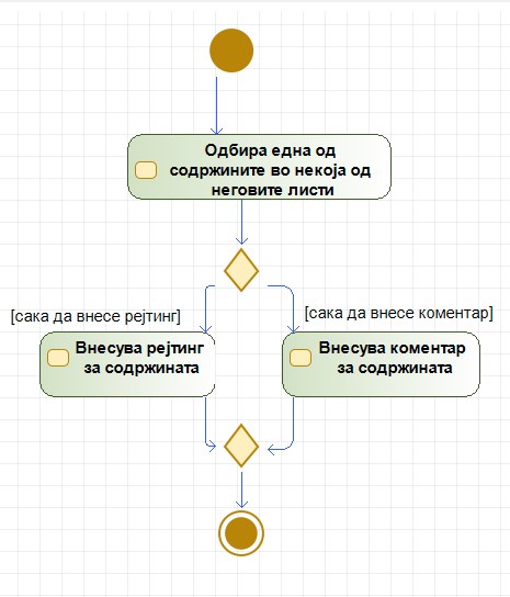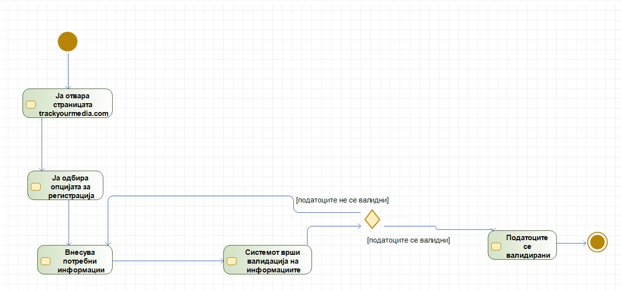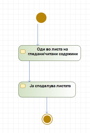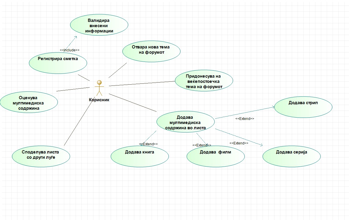 Ова претставува Use Case дијаграмот на системот TrackYourMedia со сите вклучени функционалности.Тие вклучуваат: регистрација на корисник, додавање на содржина во персонална листа, оценување на некоја содржина, отварање на нова тема во форумот и дискутирање на некоја веќе постоечка тема.